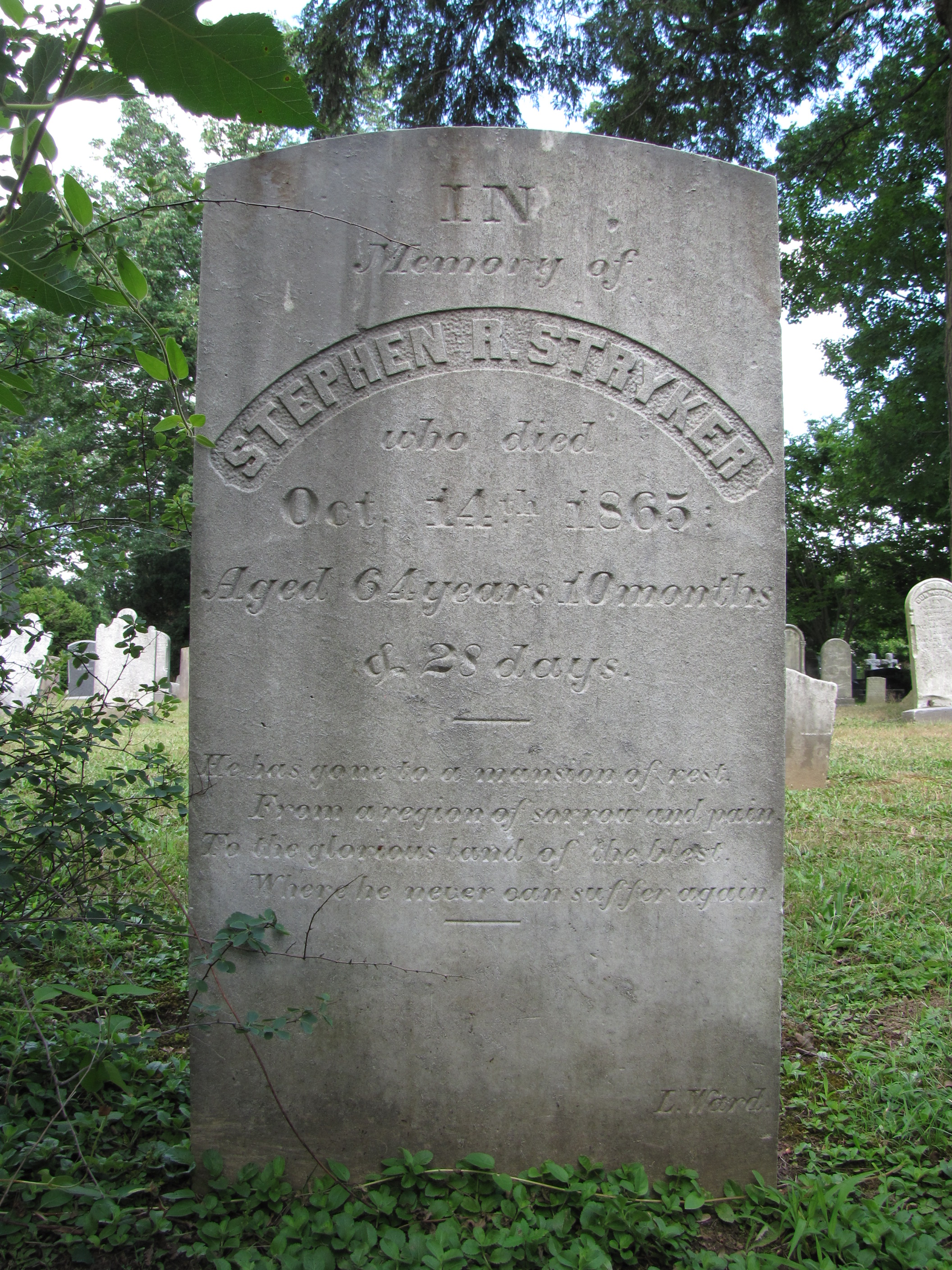 Some epitpahs read as though they are out of a can–that is they read as generic–“Gone But Not Forgotten“, for instance. While others, even though, they rhyme, which was conventional, still sound personal. The epitaph of Stephen R. Stryker, who died October 14th, 1865, at the age of 64, in the Princeton Cemetery of the Nassau Presbyterian Church at Princeton, New Jersey, sounds as if it might have been written specifically for Mr. Stryker who had suffered. His death finally relieved him from his anguish: