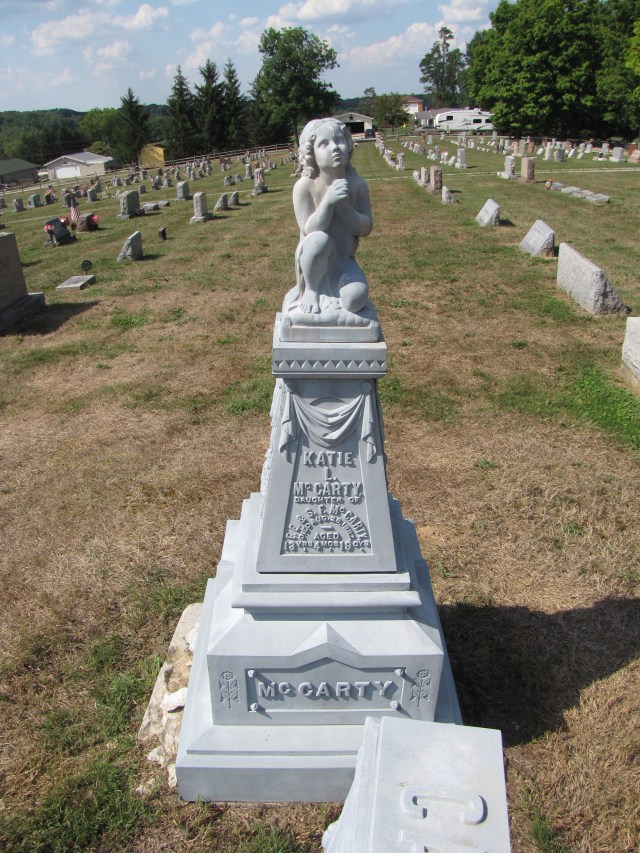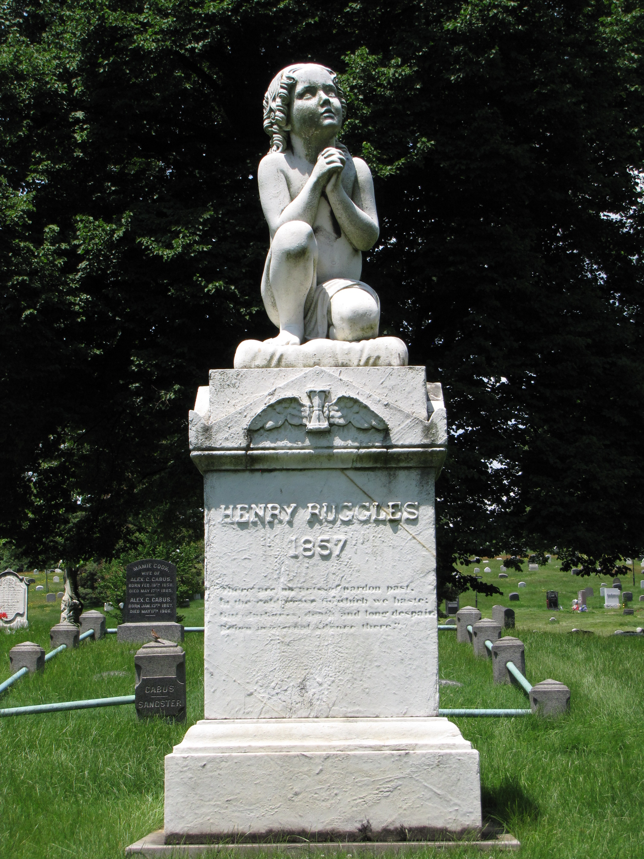 The Monumental Bronze Company of Bridgeport, Connecticut, produced white bronze cemetery markers and monuments in a wide assortment of sizes and shapes. The markers they produced often mimicked the gravestones that were being produced in stone. What traditional stone carvers created in marble and granite, the Monumental Bronze Company produced in cast zinc. Though the base is quite different on each of these grave markers, there is no mistaking the similarities between the statues of the child.