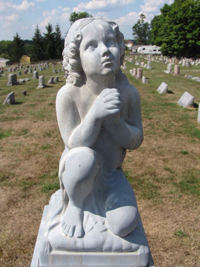 A closer look at the zinc monument of Katie McCarty portrays an innocent young child in image and word. The statue depicts a young child sitting on a pillow, looking upward to Heaven in prayer. The epitaphs on the two side panels and the back panel speak to her young age at the time of her death, referring to her as a child, a cherub, and a floweret.