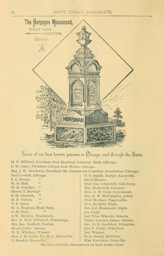 The Monumental Bronze Company of Bridgeport, Connecticut, set up their first subsidiary in Detroit, Michigan. Others followed in Philadelphia, New Orleans, St. Thomas, Ontario, Des Moines, and Chicago. The Chicago subsidiary was named the American Bronze Company.