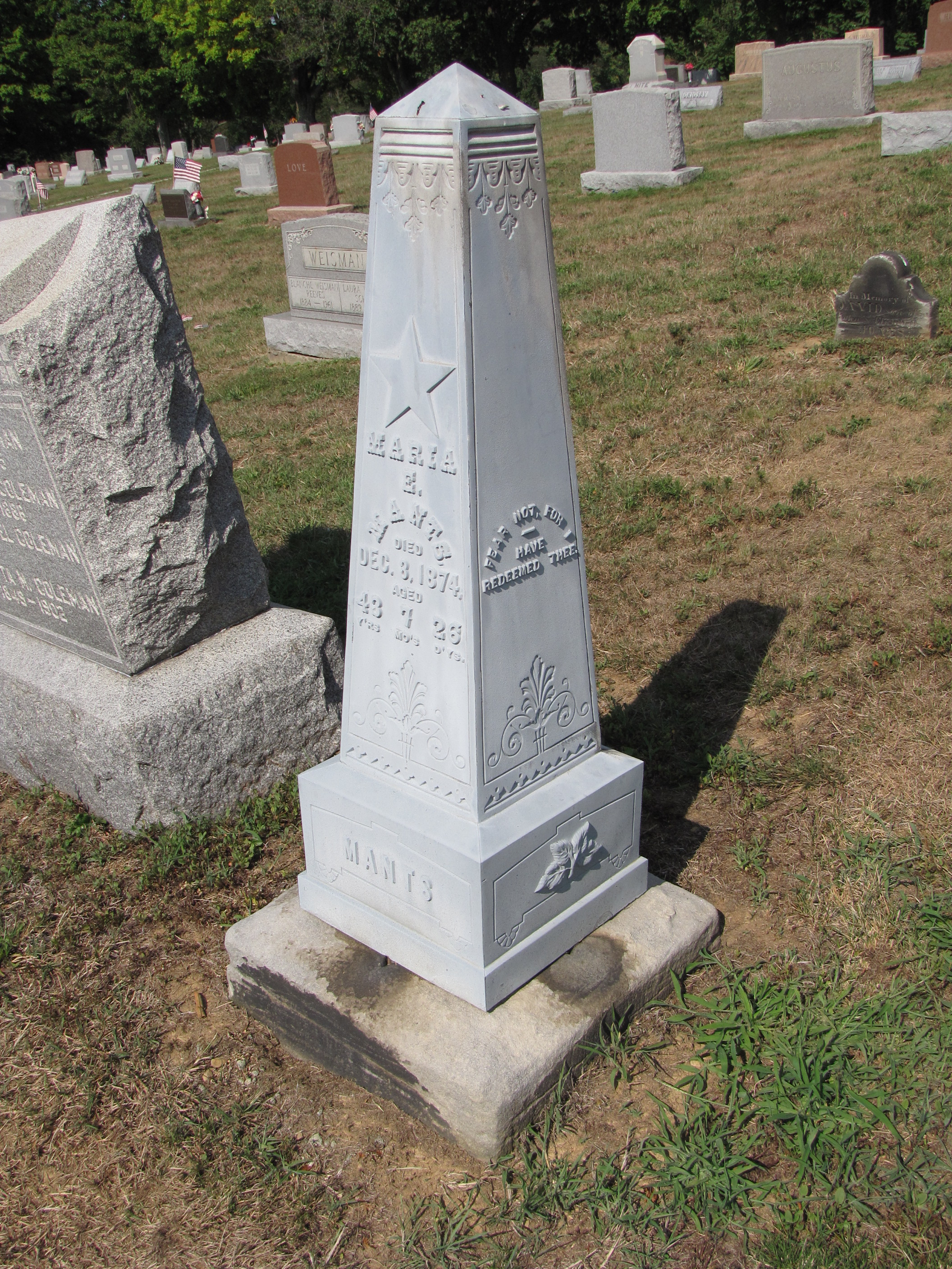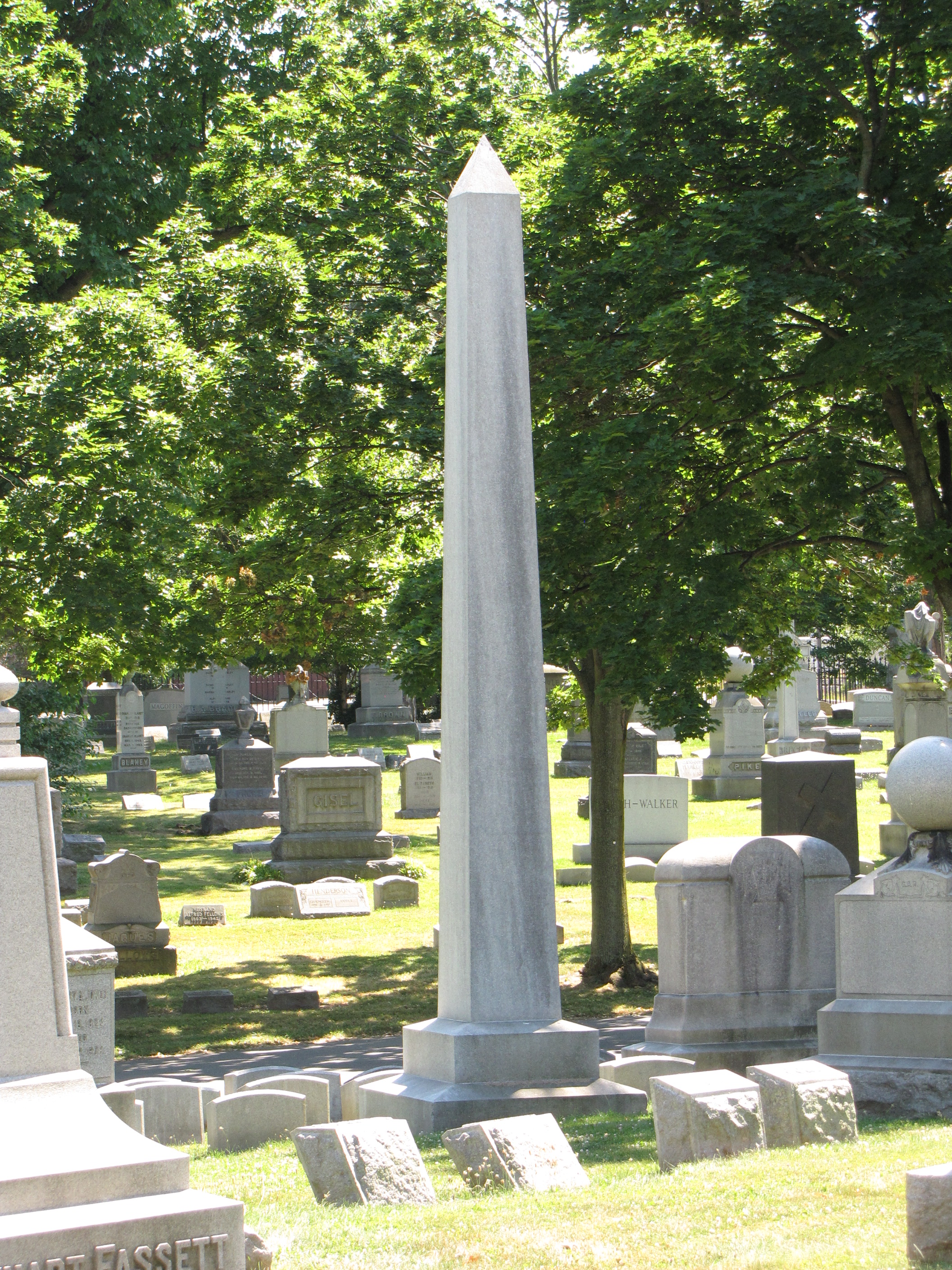After the French and British occupations of Egypt, there was a renewed interest in Egyptian architecture and symbolism in America, including the obelisk, those tall thin four-sided columns that tapered upward and then end in a pyramid at the top.  The obelisk is a ubiquitous gravestone shape found in American graveyards.  They range from short obelisks like the zinc-cast obelisk in the Somerset Cemetery at Somerset, Ohio, which is only a few feet tall to soaring monuments upwards of 30 to 40 feet like the obelisk in the Forest Lawn Cemetery at Buffalo, New York, pictured below.