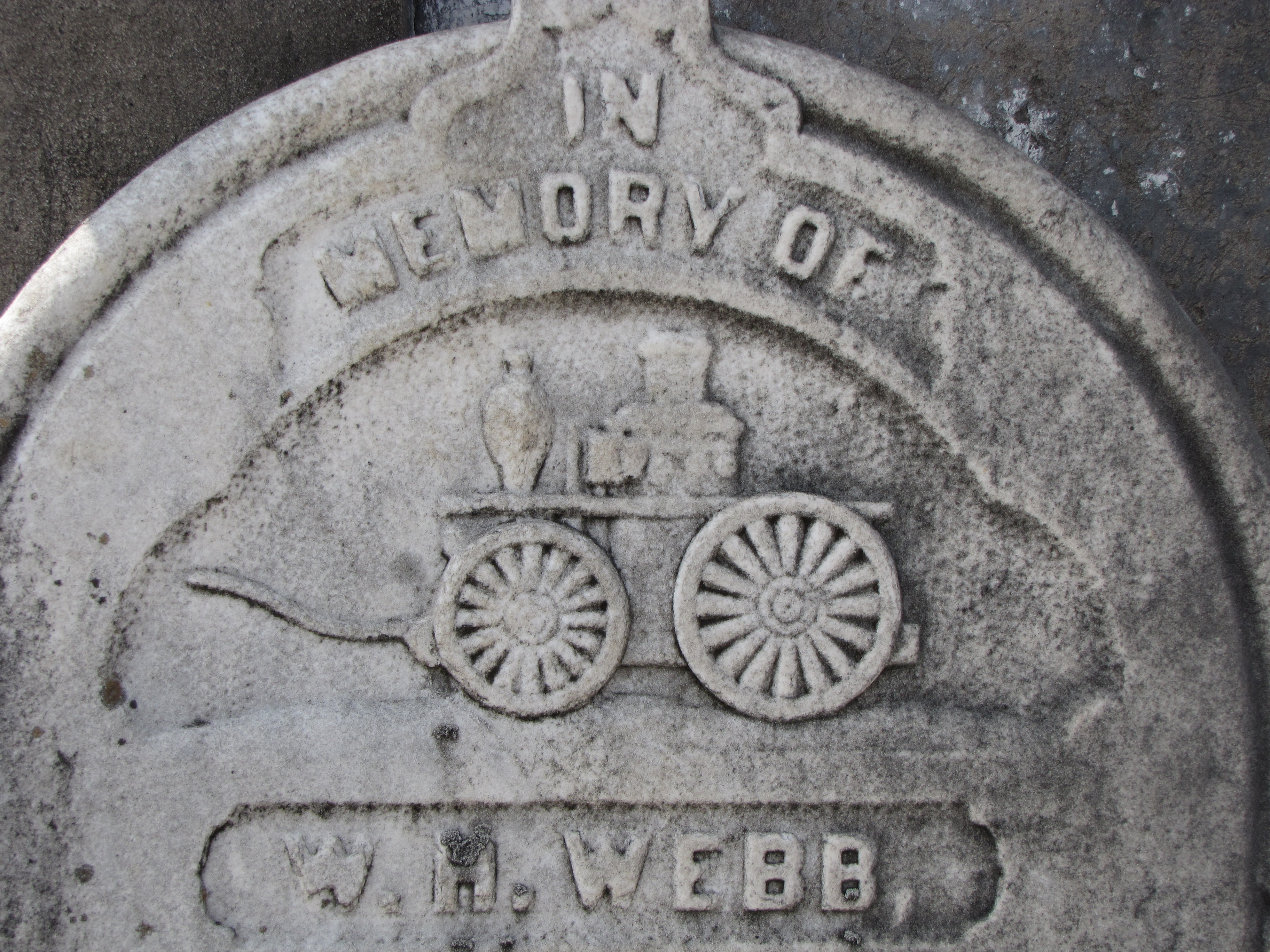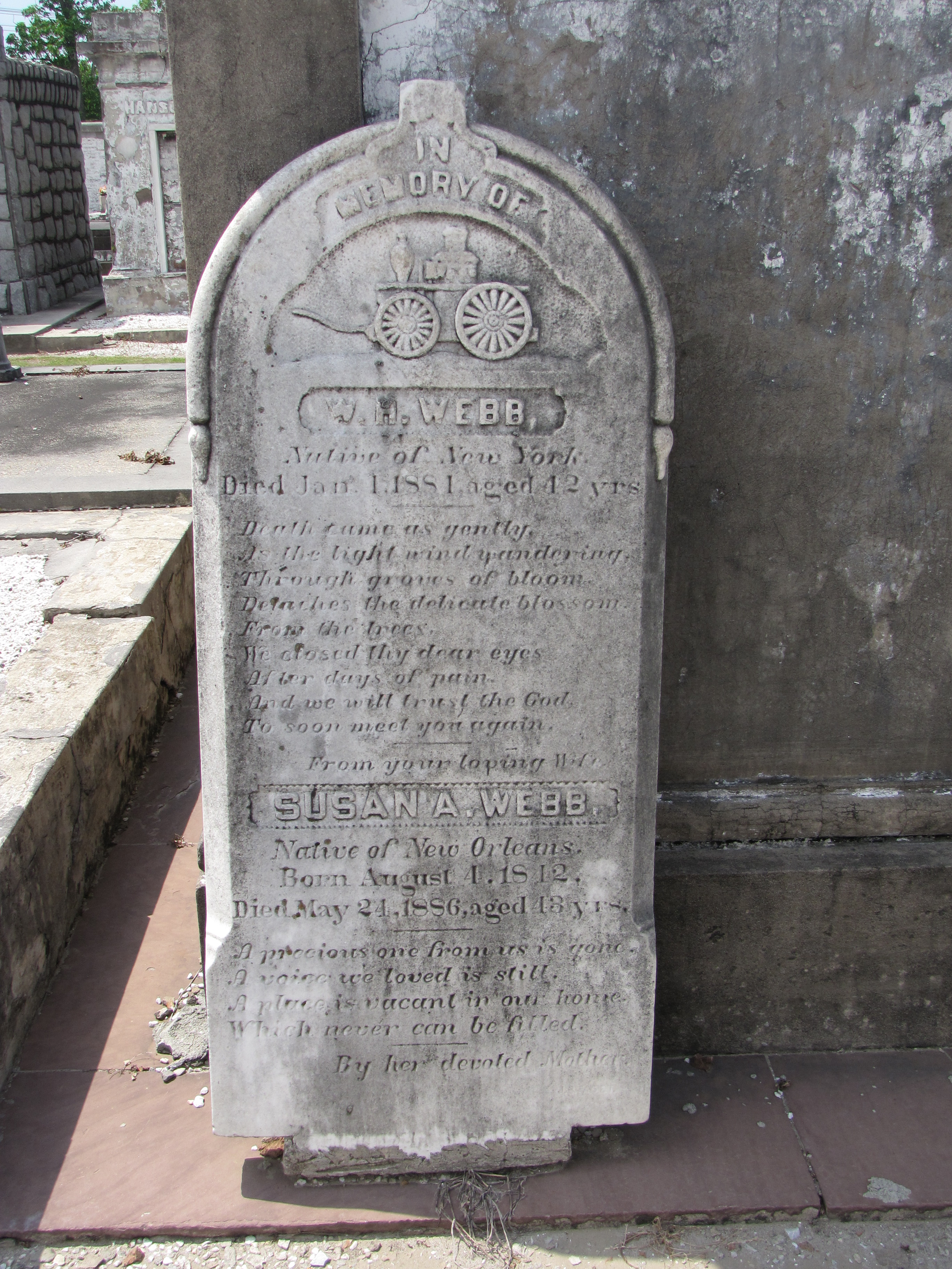 Many individual gravestones in the Cypress Grove Cemetery at New Orleans are dedicated to firefighters. The gravestone of W. H. Webb, propped up against a tomb, is decorated with a pumper signifying his service as a fireman.