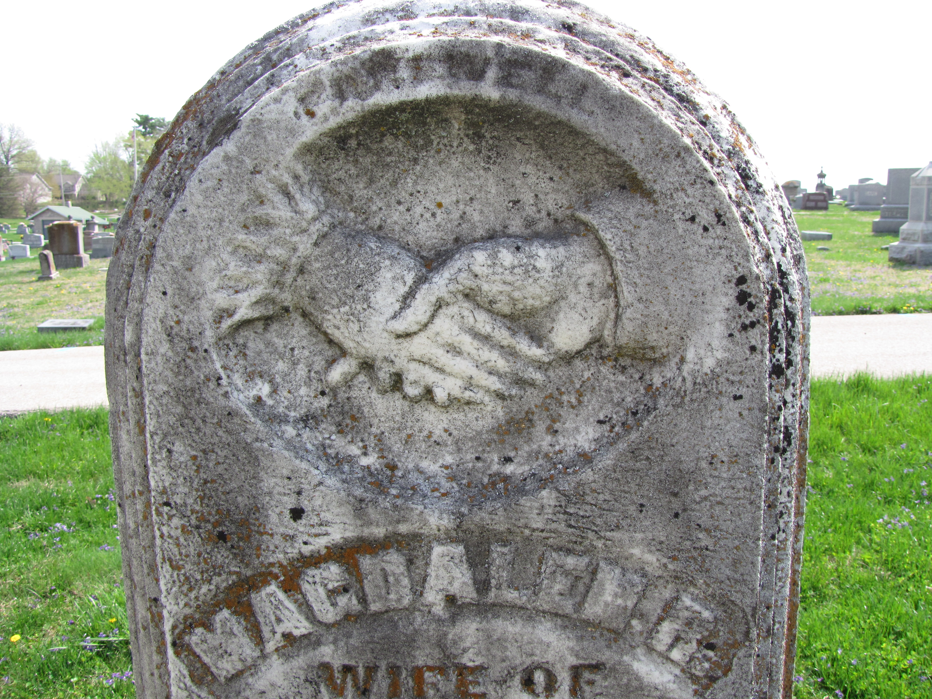The gravestone of Magdalen Blakely at the Clear Creek Christian Church Cemetery at Bloomington, Indiana, displays one of the most common motifs found in American cemeteries—clasping hands. The clasping hands on this gravestone represent holy matrimony, symbolizing the holy union between a man and a woman. The hand on the left side of the motif is clearly the hand of the female, her cuff is ruffle. The hand on the right side is the male’s, with a shirt’s cuff barely visible from underneath a suit jacket.