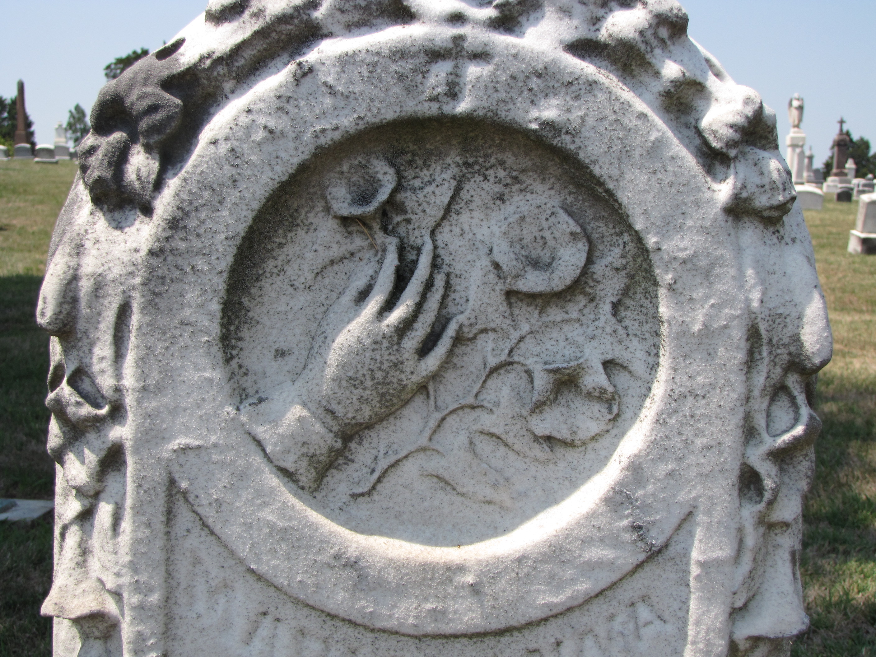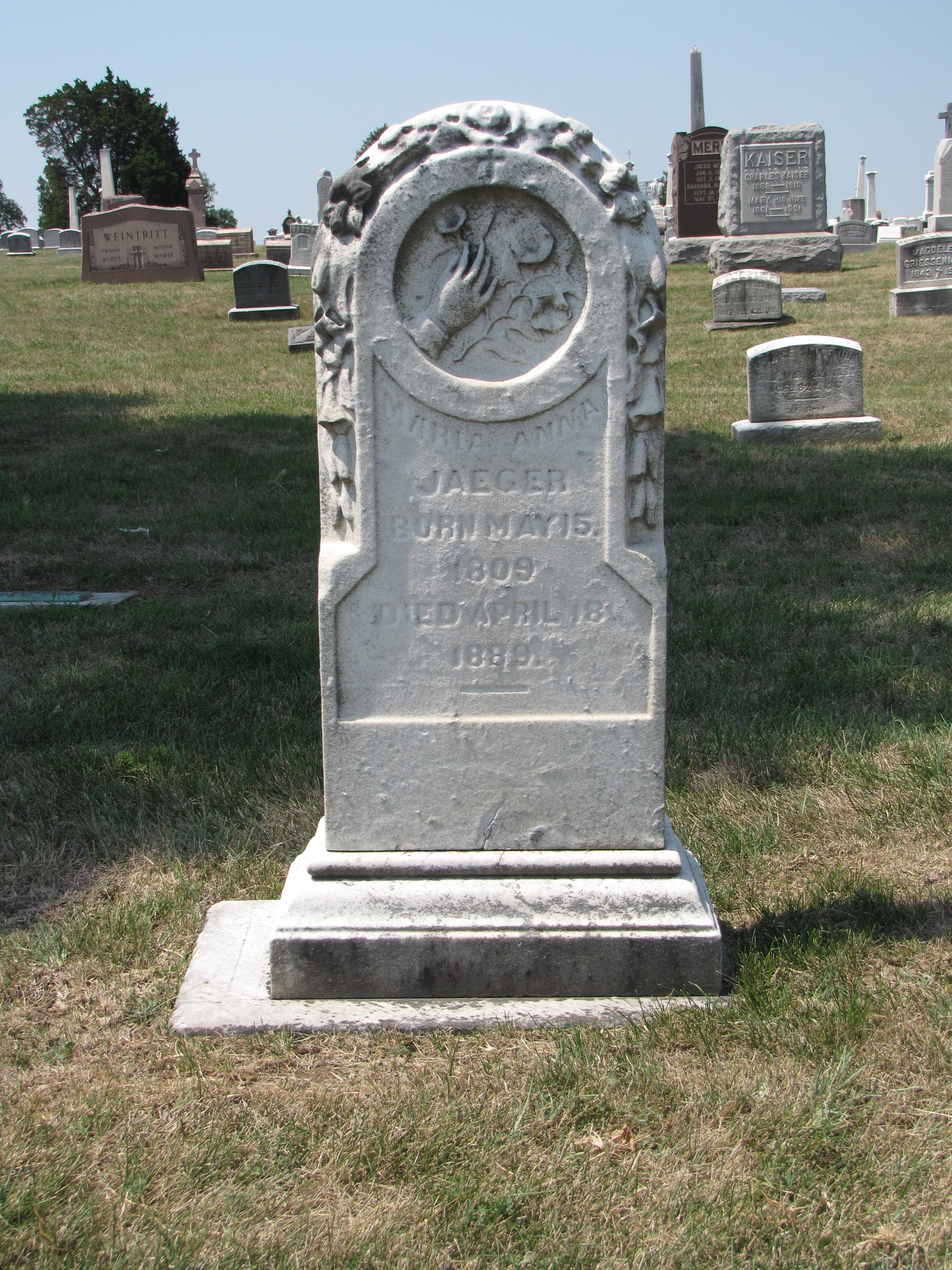 Maria Anna Jaeger’s gravestone in the Mt. Calvary Cemetery, at Columbus, Ohio, was erected at nearly the height of the Victorian Era and displays the high ornamentation that characterized that time period.  Her gravestone is festooned with flowers, though, the white marble rounded-top tablet has eroded and much of the detail has been lost.  The circle inset, however, clearly displays a woman’s delicate hand holding a sprig of morning glories.