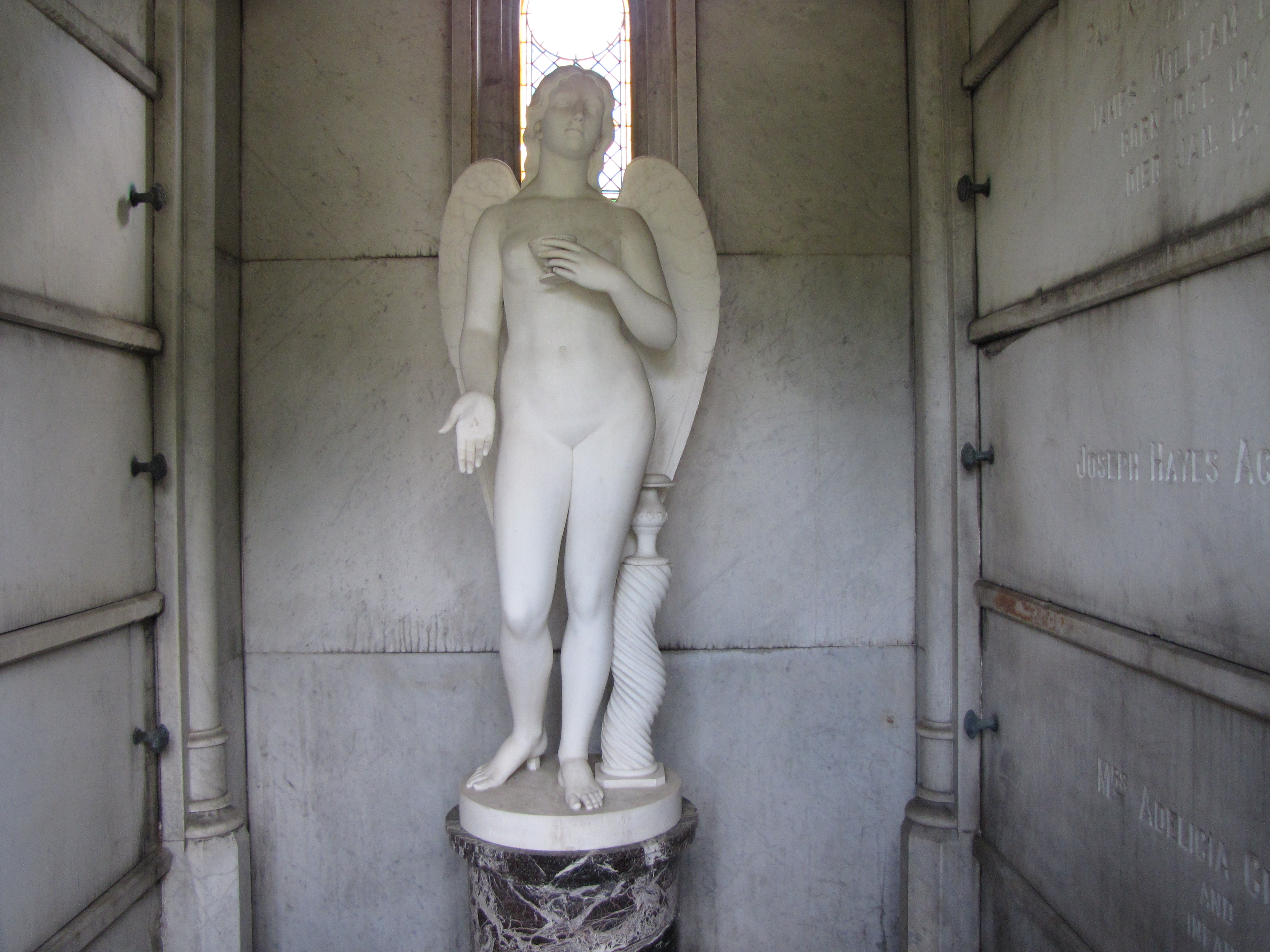 Inside the mausoleum is a magnificent statue of a nude winged angel.  The state of nudity in this statue symbolizes virtue and innocence.  This theory reflects the classical teachings of Plotonius who taught that the nude body was divine and without sin.  The idealized nude body was a reflection of the image of God Himself and therefore good and beautiful.  This angel represents the Neoplatonic ideal of nuditas virtualis, the state of innocence.