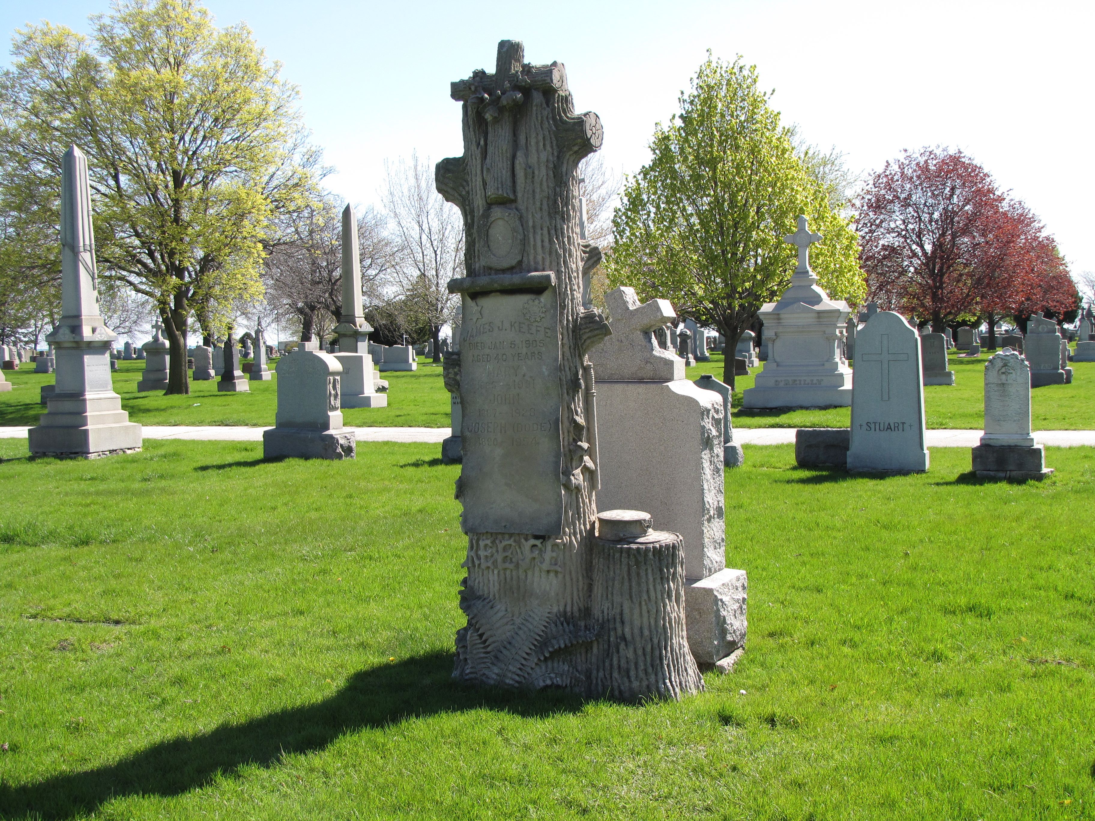 Many tree-stump gravestones were carved to showcase individual characteristics about the deceased for which the marker was made. In this case, the tree-stump marker was carved for 40-year old James J. Keefe who had been a police officer (Badge #1620) in the Chicago Police Department. His occupation is indicated on the tombstone with a night stick hanging from a limb and a policeman’s cap resting on the stump.