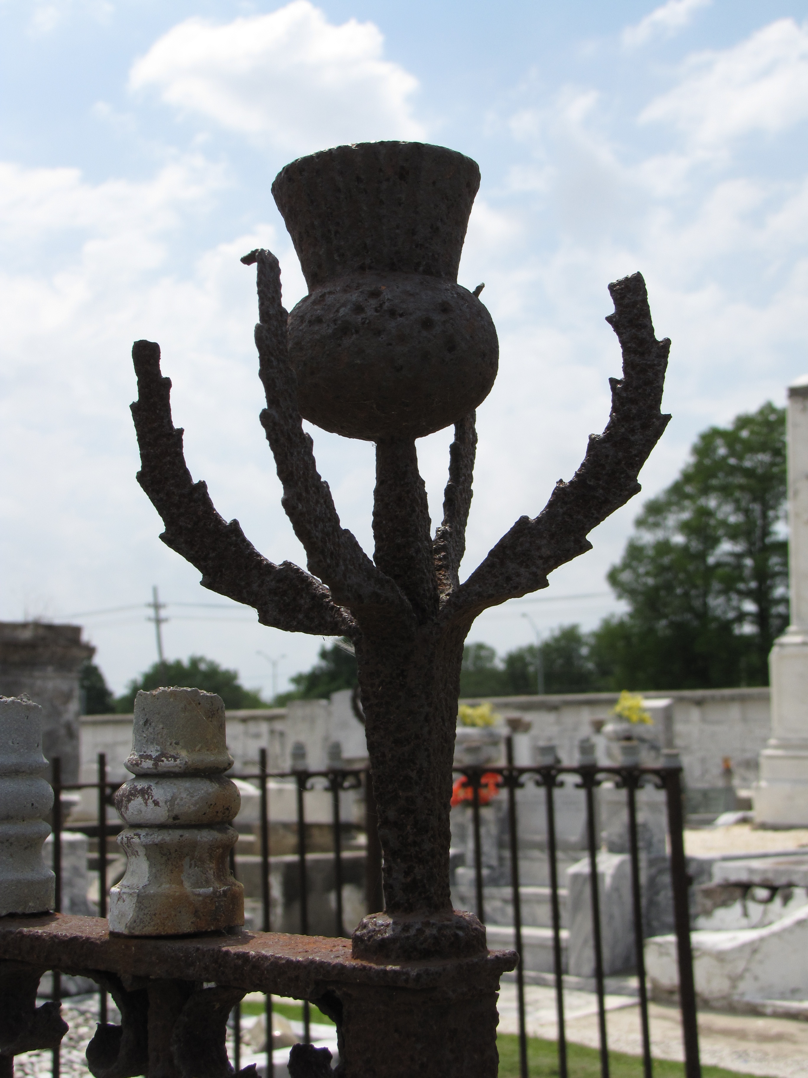 Symbolism and funerary art found in cemeteries is not limited to the gravestones. Rich detail and iconography can also be found in the gates and iron work that surround many graves and adorn mausoleums. The Cypress Grove Cemetery in New Orleans, Louisiana, has many samples of ornate metal work. One of the graves is surrounded by iron work topped by thistles. Unfortunately, the gravestone is missing.