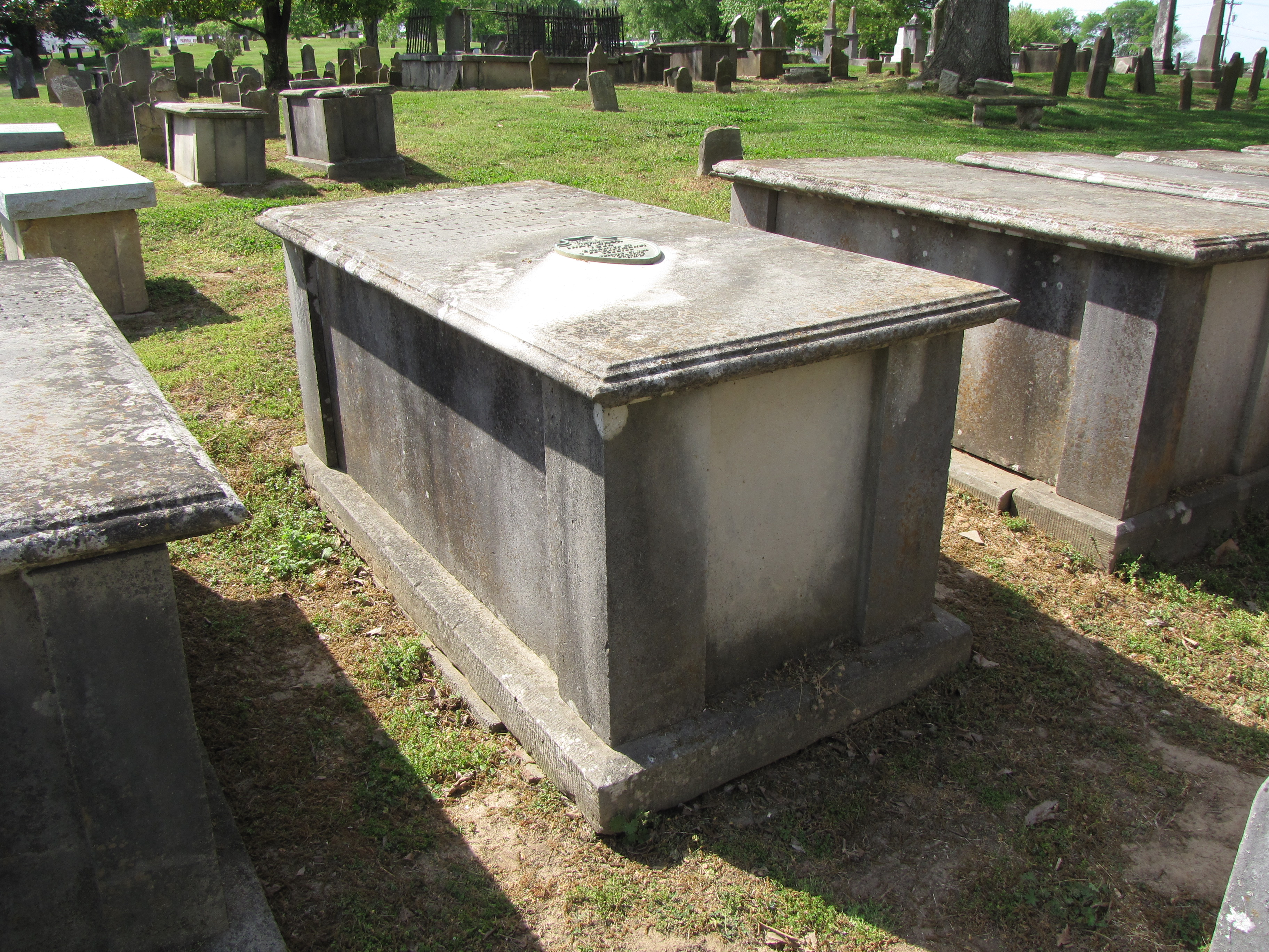 Chest tombs are fairly common in 19th Century American graveyards but were built without the effigy. They were also referred to as false crypts because the coffin was not inside the chest tomb, but buried underneath underground. The example in the photograph below is from the Greenwood Cemetery at Franklin, Tennessee. The tomb marks the grave of Jane Knox Polk, the Mother of President James Knox Polk.