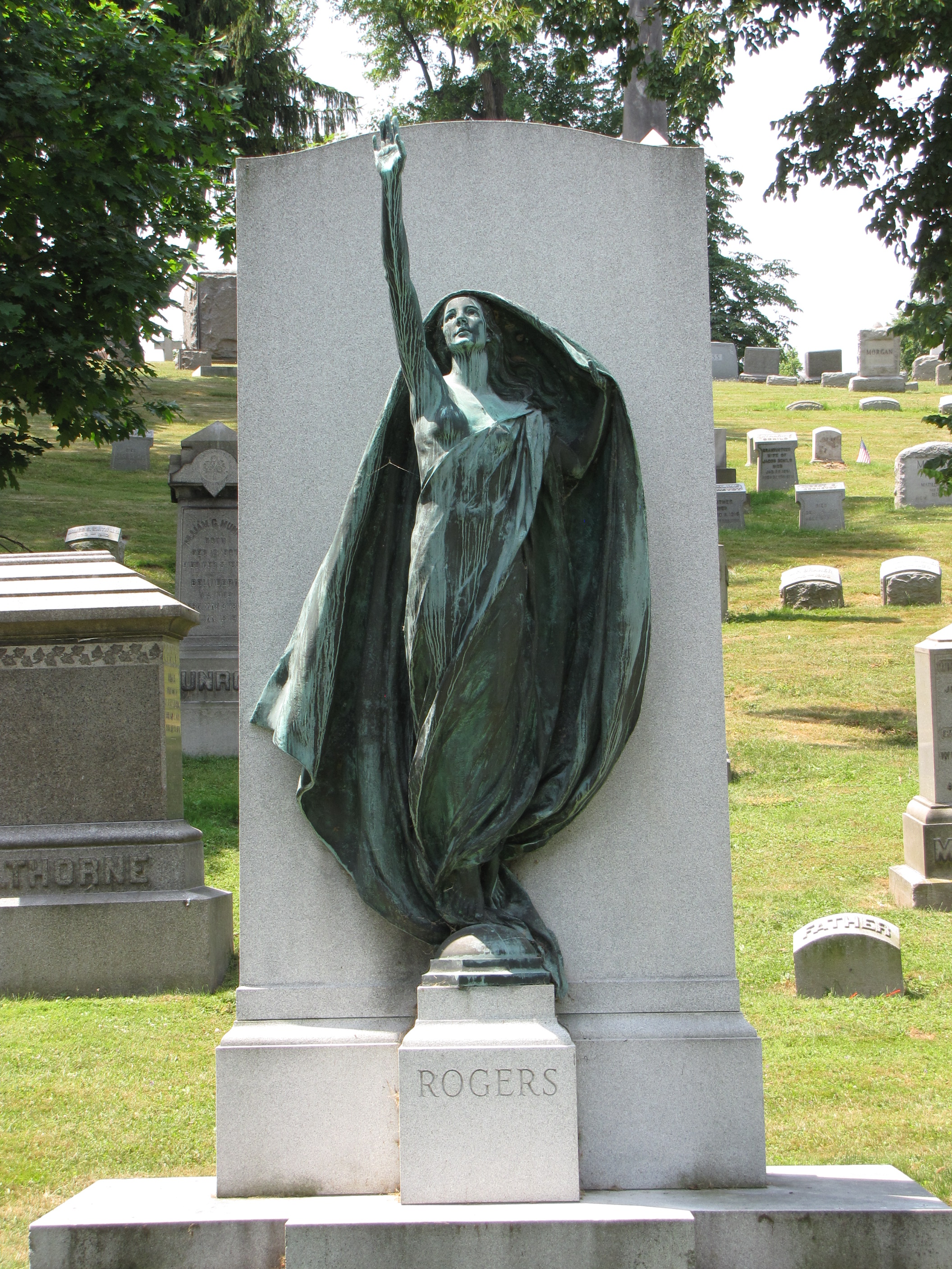 The sculpture is titled, “Aspiration” and was created in 1926 by Harriet Whitney Frishmuth (1880-1980) for the William Arthur Rogers (1851-1946) monument in the Forest Lawn Cemetery at Buffalo, New York.
