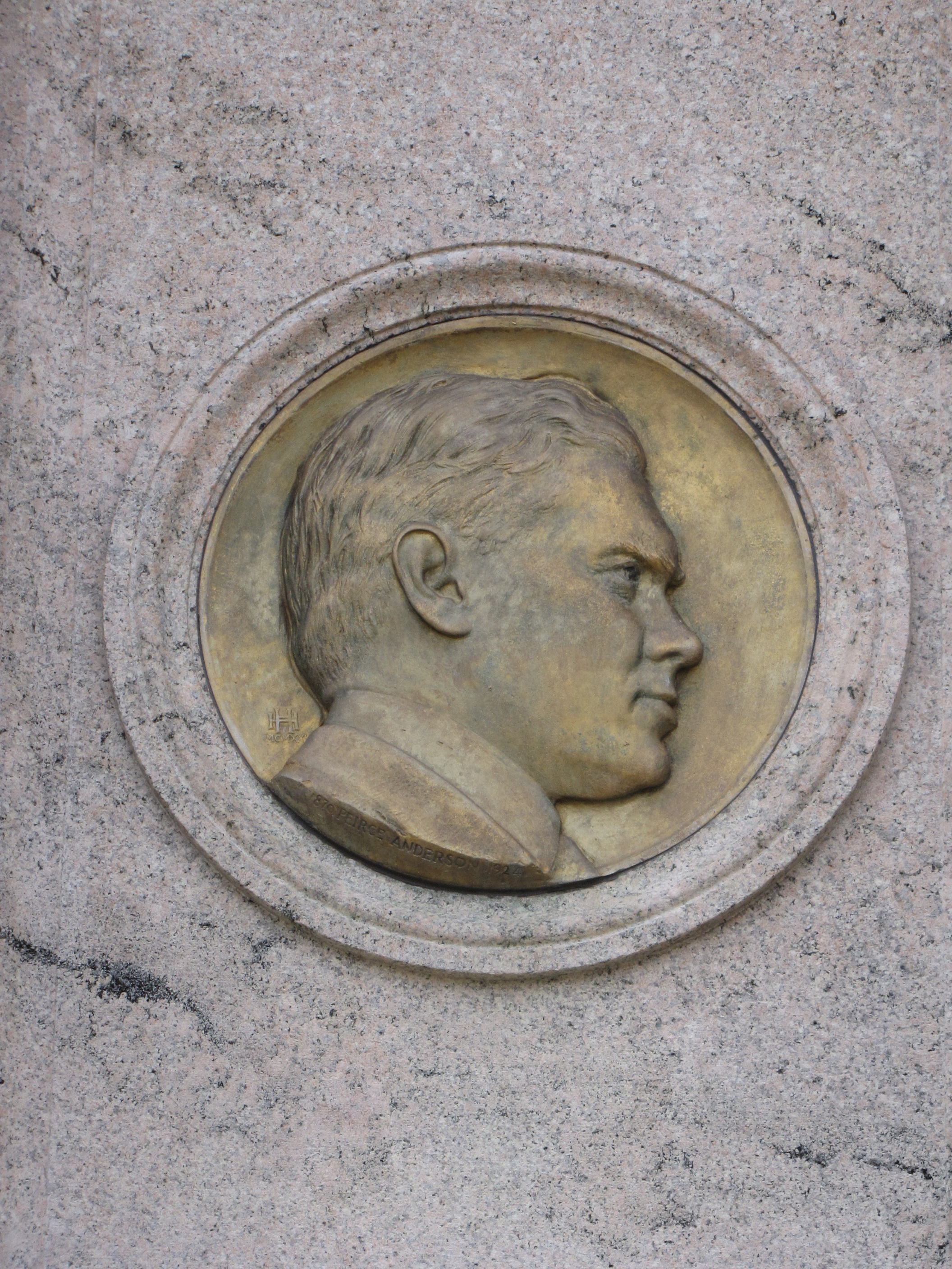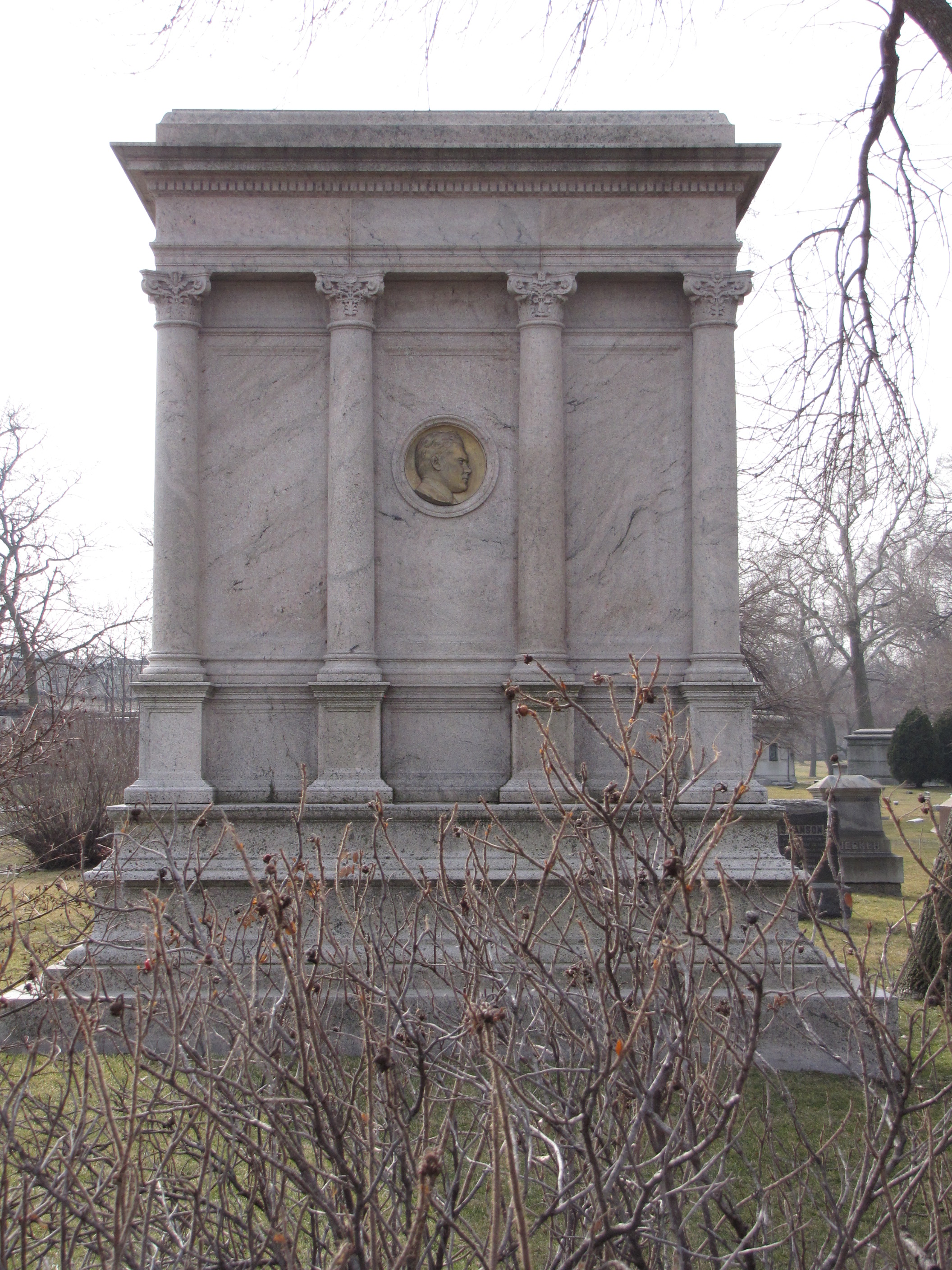 The light rose-colored unpolished granite monument, built to honor William Peirce Anderson, is a bit of an enigma. The large neo-classic monument, with its Corinthian columns very nearly hides who is buried beneath. The only clue is the bronze medallion in the center of the monument that bears a bas-relief profile of the celebrated Chicago architect. There is no inscription carved anywhere in the stone.