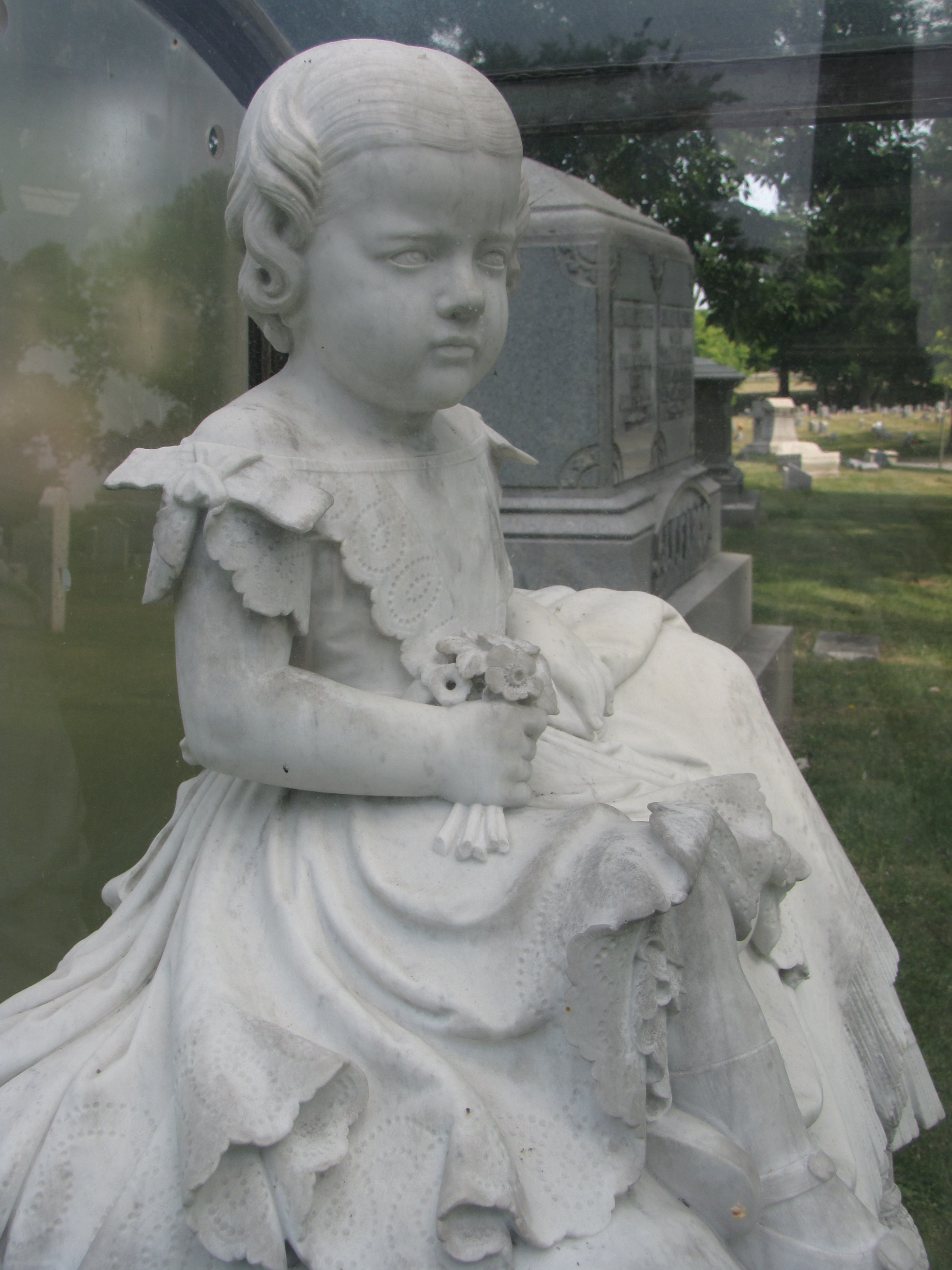 A pristine example of a child being memorialized in stone can be found in the Forest Lawn Cemetery at Buffalo, New York. The elaborate white-marble sculpture, preserved and encased in glass, portrays the twenty-one month old daughter of J. F. and Hannah Fargo, Tacie Hannah Fargo. The little girl is positioned sitting on top of a tasseled blanket gripping a small bouquet of flowers.