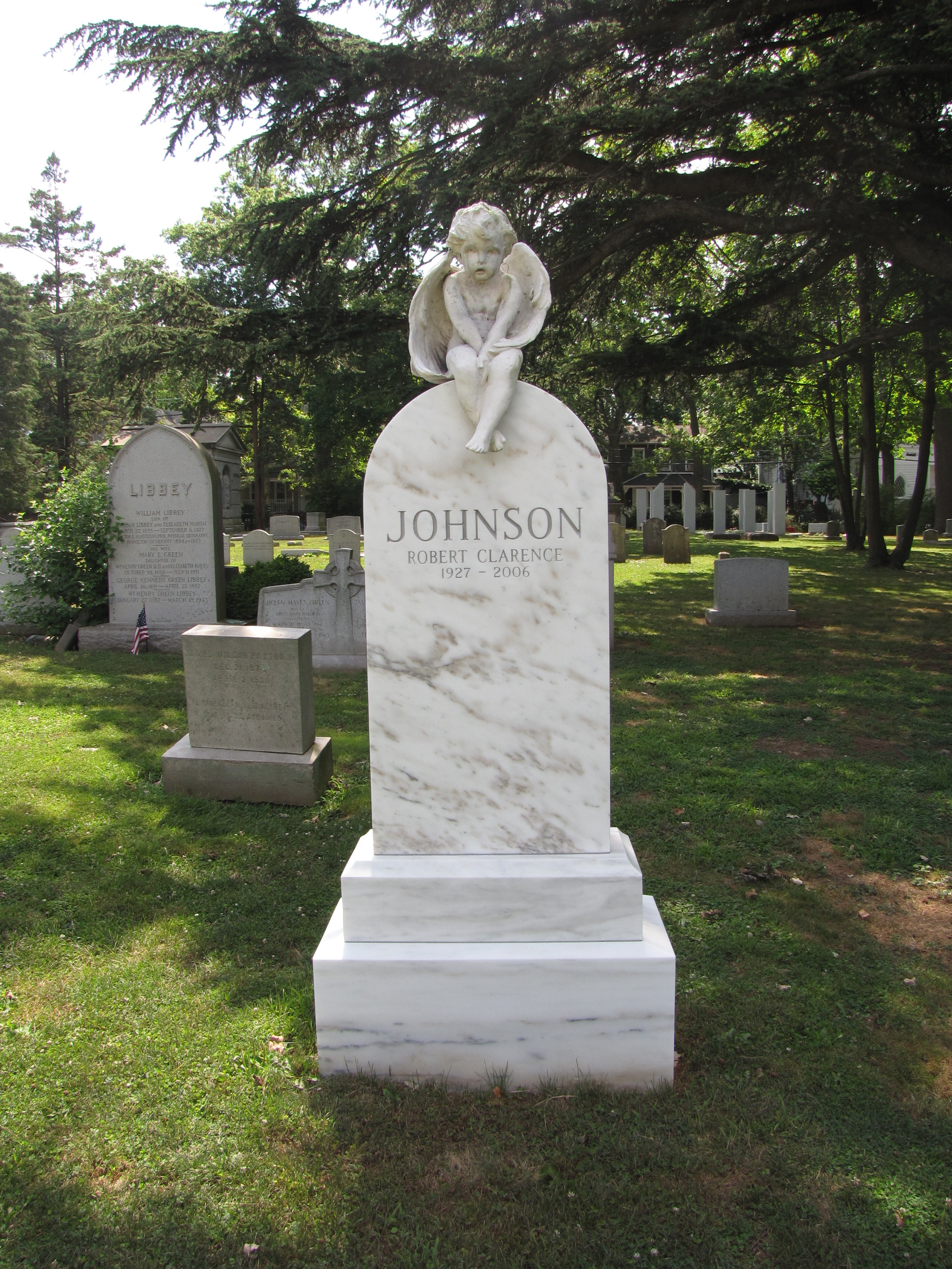A bewildered-looking angel is gingerly perched on top of the rounded top white marble tablet marking the grave of Robert Clarence Johnson in the Woodward Hill Cemetery at Lancaster, Pennsylvania.