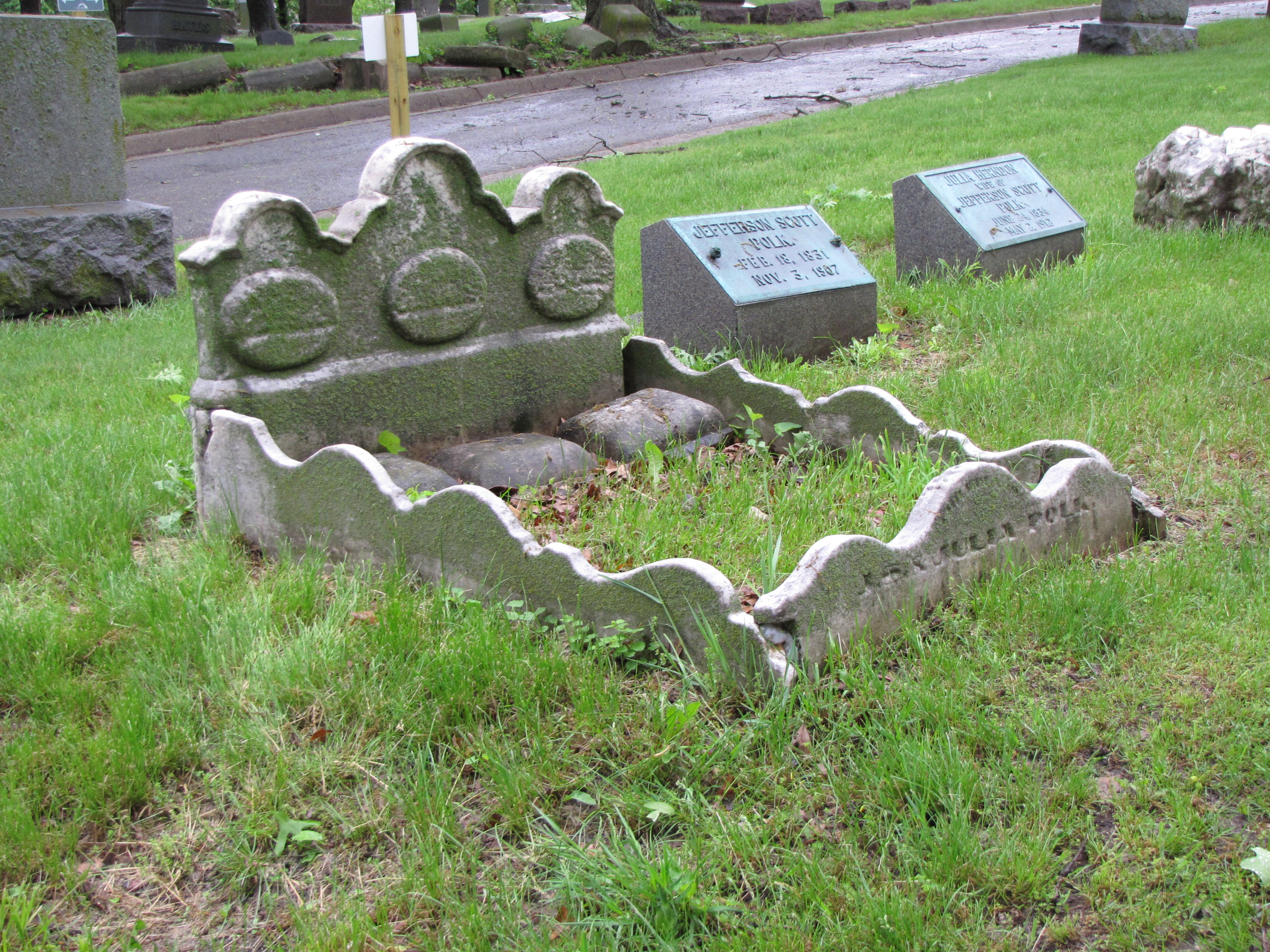 In the Woodland Cemetery at Des Moines, Iowa, the gravestone for three children of Jefferson Scott and Sarah Polk is made to look like a bedstead with three small pillows at the headboard, one pillow for each child. The gravestone is badly weathered but the names of each of child was carved in an oval on the headboard. The footboard is carved with their parents’ names, “Children of J. S. & Julia Polk“.