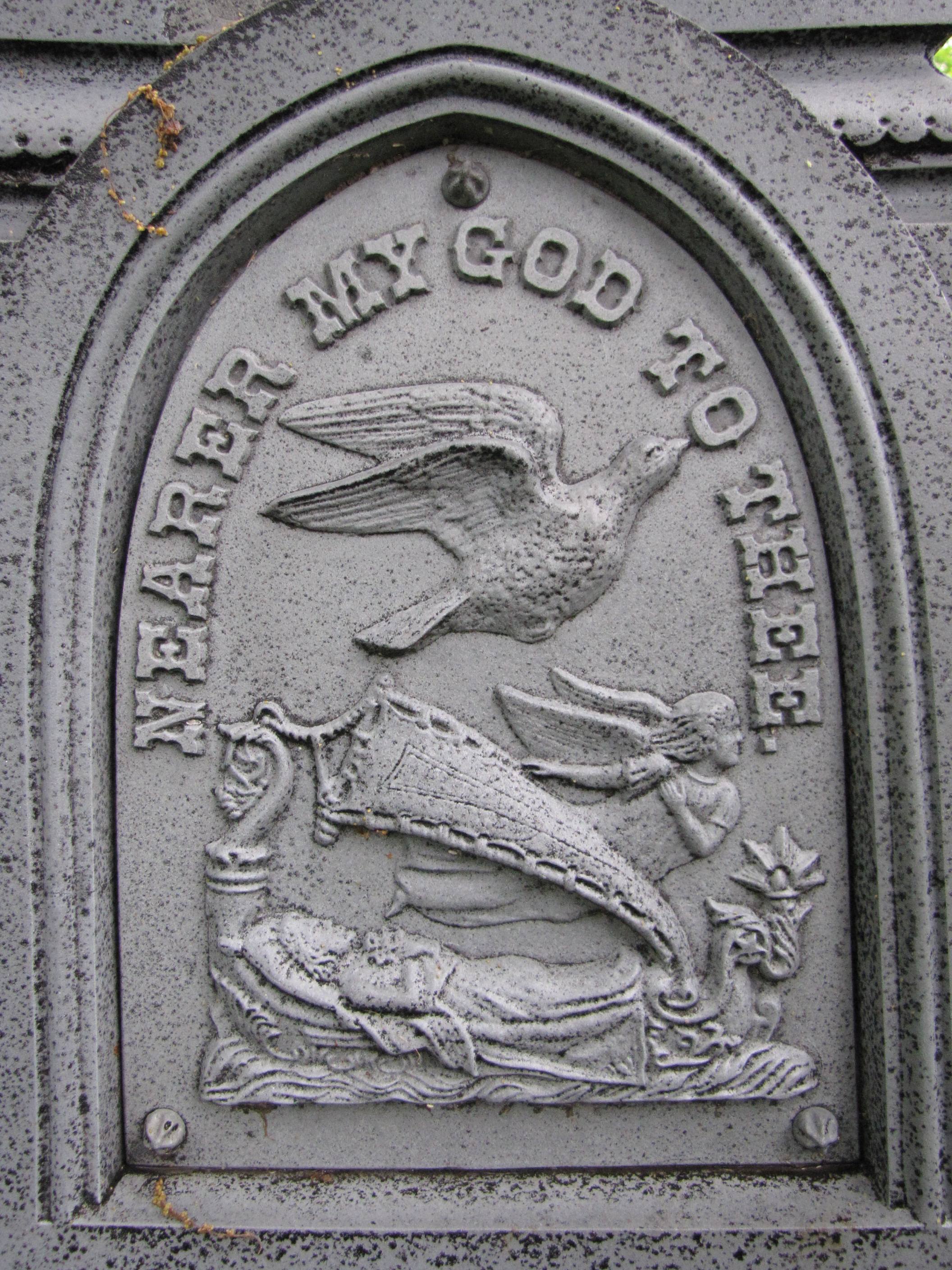 The Western White Bronze Company of Des Moines, Iowa, and the other companies that produced zinc funeral monuments made many variations. The popular symbols came in multiple forms. The various symbols could be bolted in place by special order much the same way that an erector set is bolted together. Sometimes a symbol was available in a bas-relief and sometimes it could be purchased as a statue in the round. Others such as this boat could be found by itself or with a dove ascending over the boat.