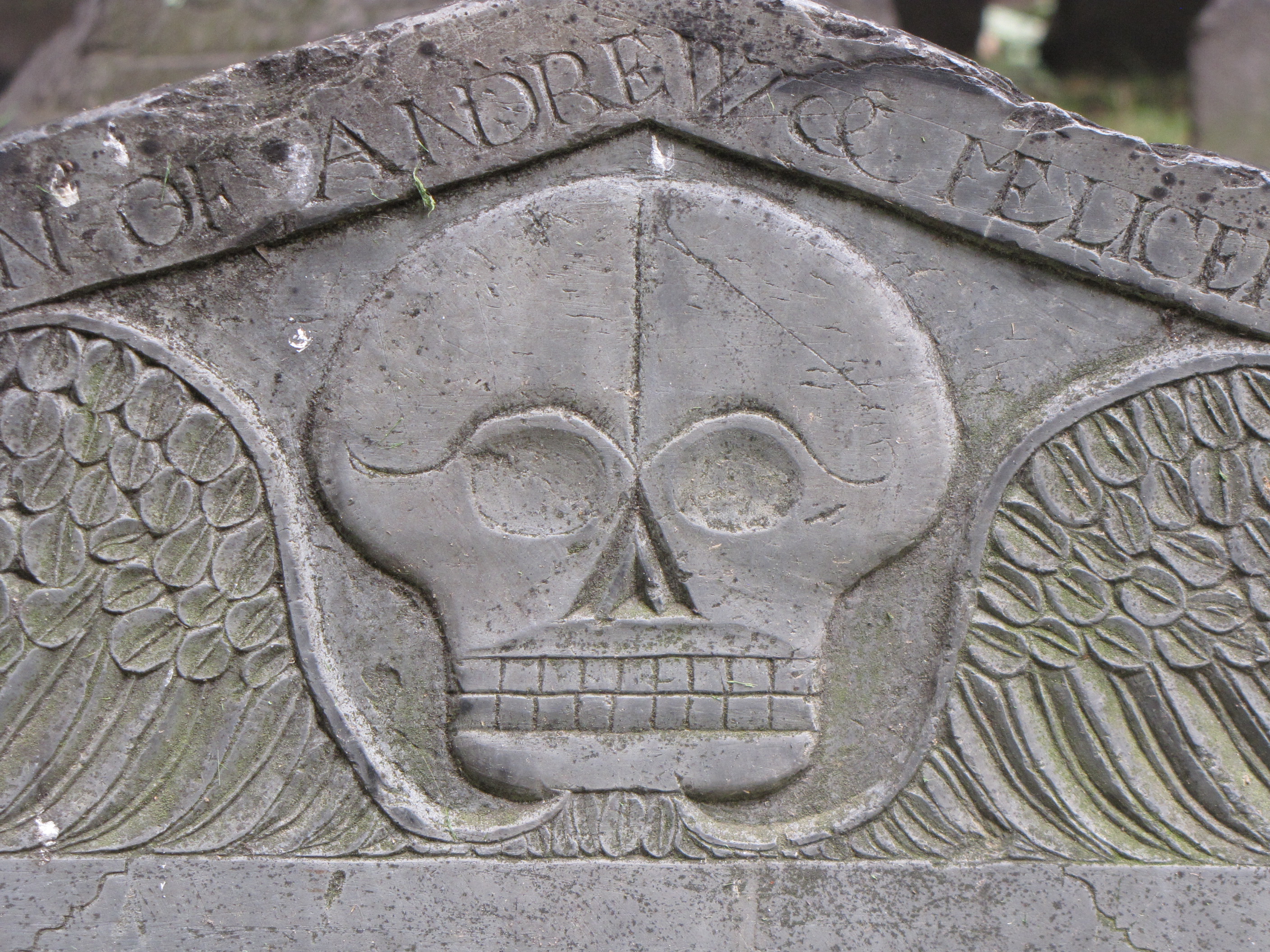 The Latin phrase, “tempus edax rerum” translates to “time: that devours all things”. Just under the phrase, is an incised carving of an hour glass referring to time. Combined with the flying death’s head with its grinning smile, hollow eyes, and downward sweeping wings, the symbolism, epitaph, and the gravestone itself are reminders that death is never far away. The corollary to that is that life is fleeting.
