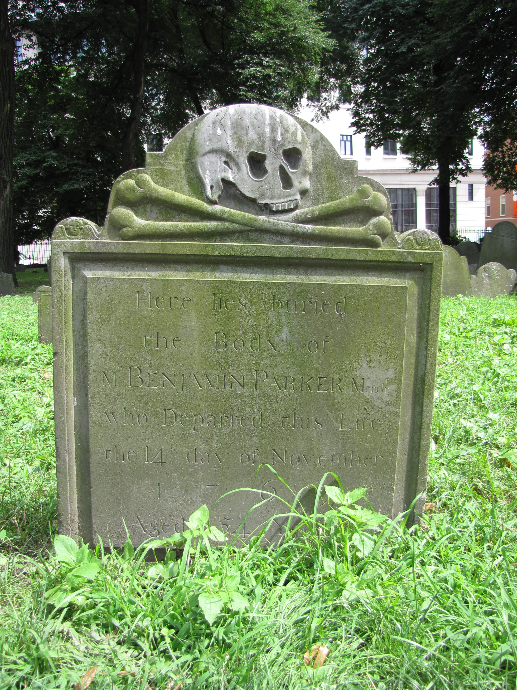 Here again on this gray slate gravestone in the Granary Burying Ground at Boston is an example of the skull and crossbones symbol broadcasting the message to “remember death”. This gravestone, however, is a bridge between the memento mori symbolism meant to remind that life was short.