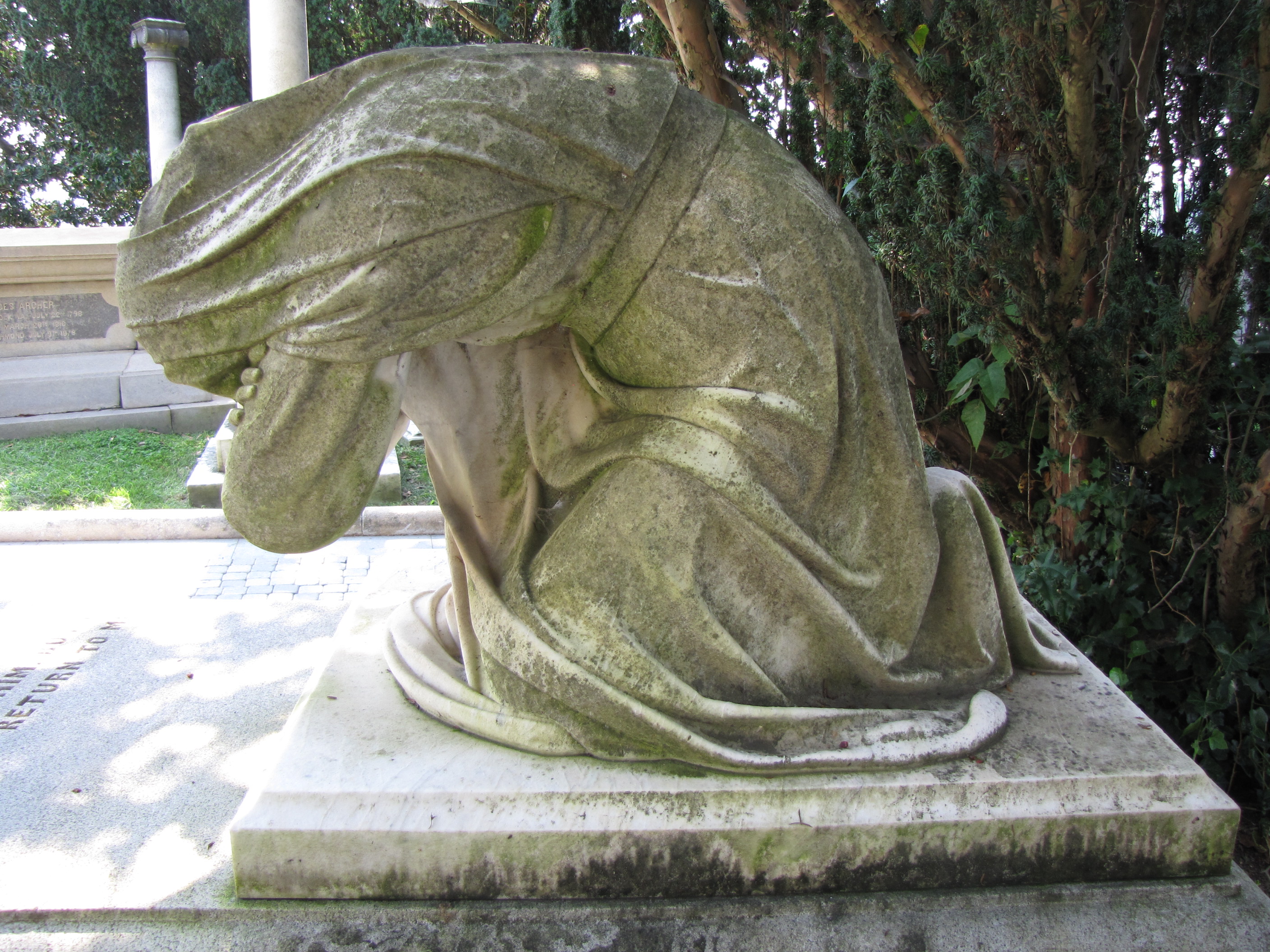 “Grief” is a statue designed by Edward V. Valentine for the William Worthington monument in the Hollywood Cemetery at Richmond, Virginia.  Worthington was only 29 years old when he died. The statue was commissioned by his step father to commemorate his death and his mother’s deep sadness. “It is a story of a woman’s grief—the grief of a mother over the death of her son, symbolized in a kneeling female figure, with arms folded and head bowed in the utter abandonment of self-communion.”*  Even though, the grieving woman’s face is completely shrouded the statue conveys the anguish of the mother through the position of the body.