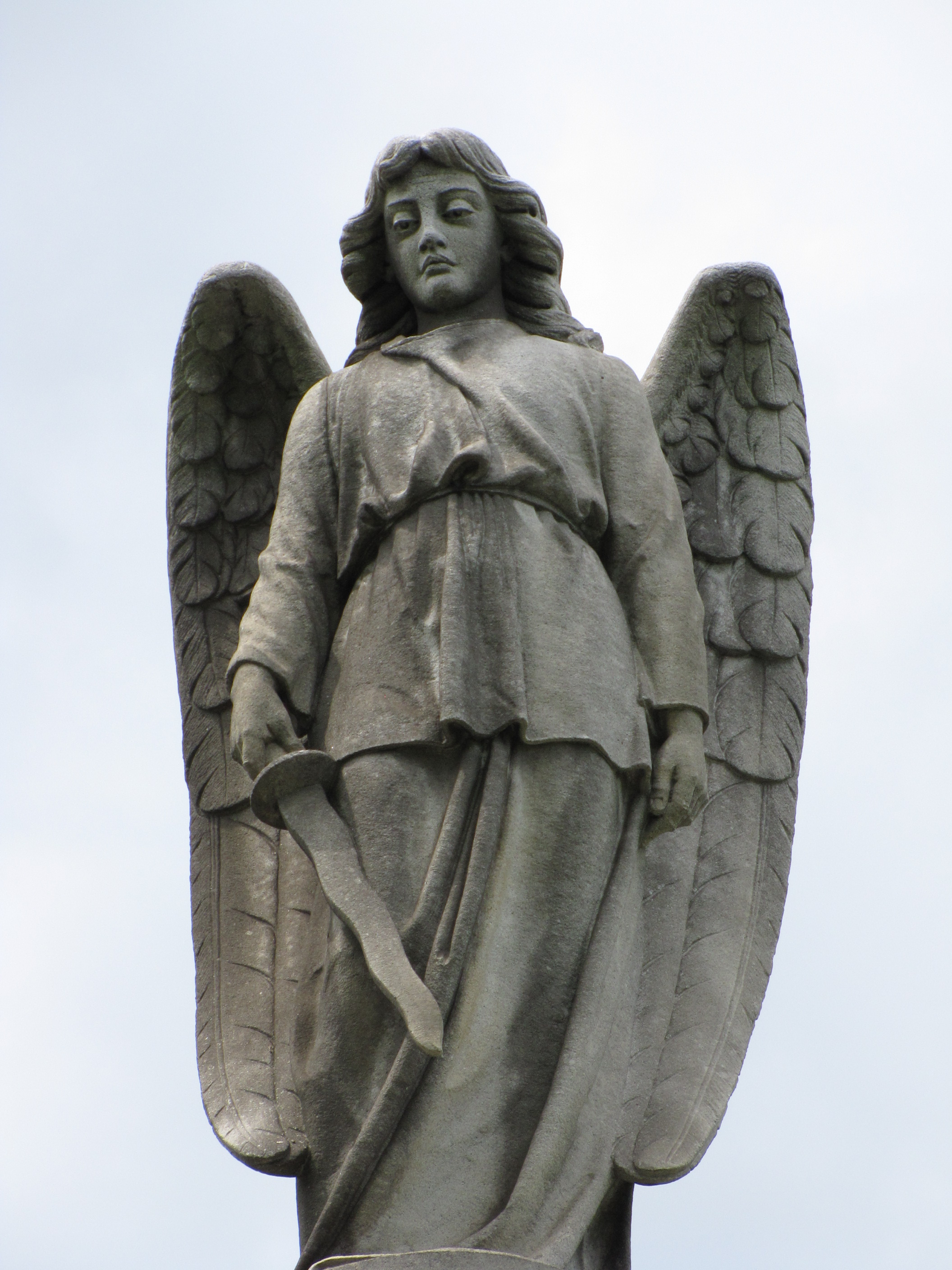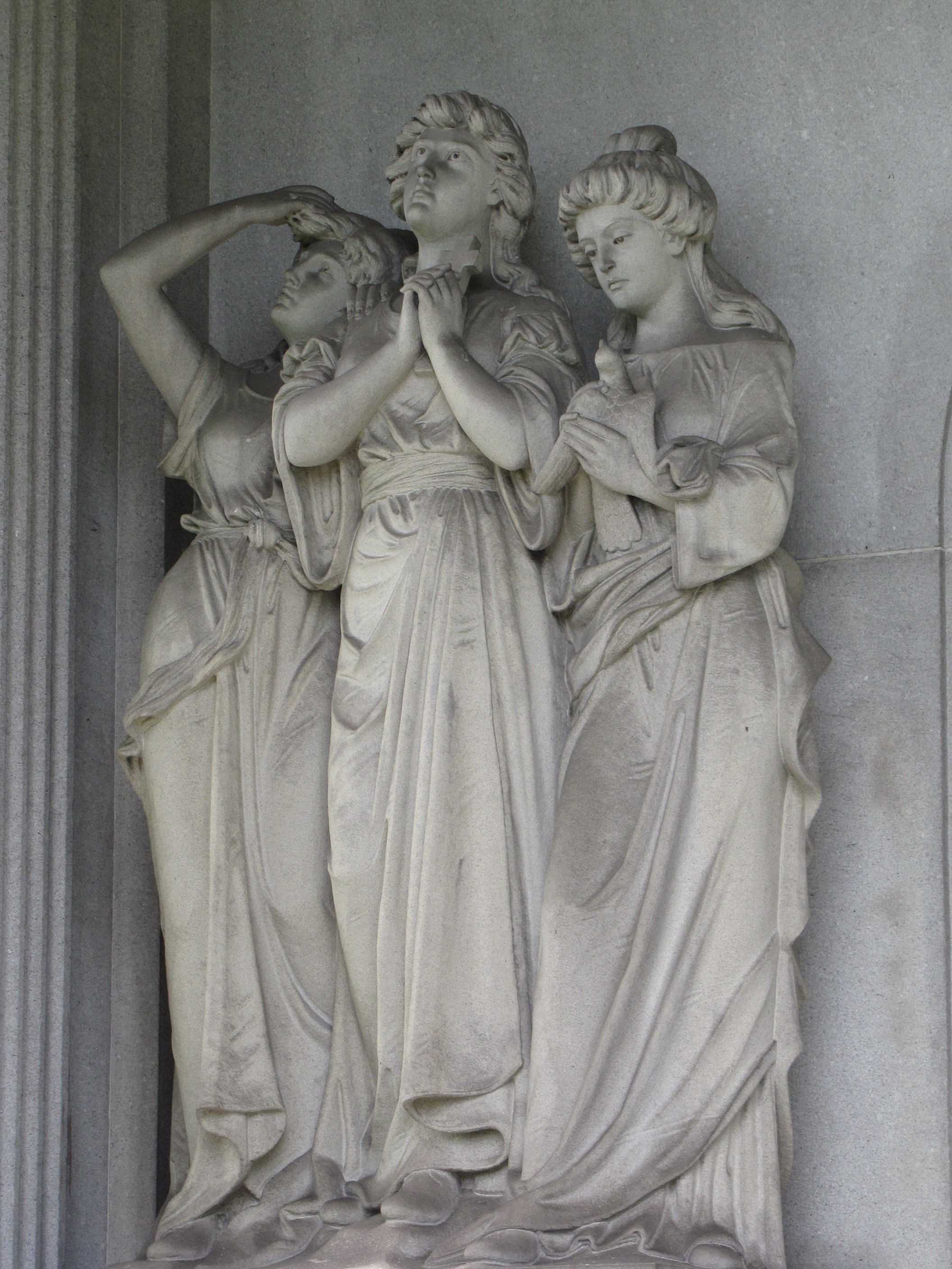 Two large urns flank the steps leading to the mausoleum.  The columns feature Corinthian capitals.  On each side of the doorway is a trio of mourning figures—the left side holding symbols of faith such as the cross and the dove—the right side showing their grief and sorrow. The pediment features two winged cherubs holding a wreath with the initial “F” in the center. The temple is topped with a cupola with the Archangel Michael standing guard.