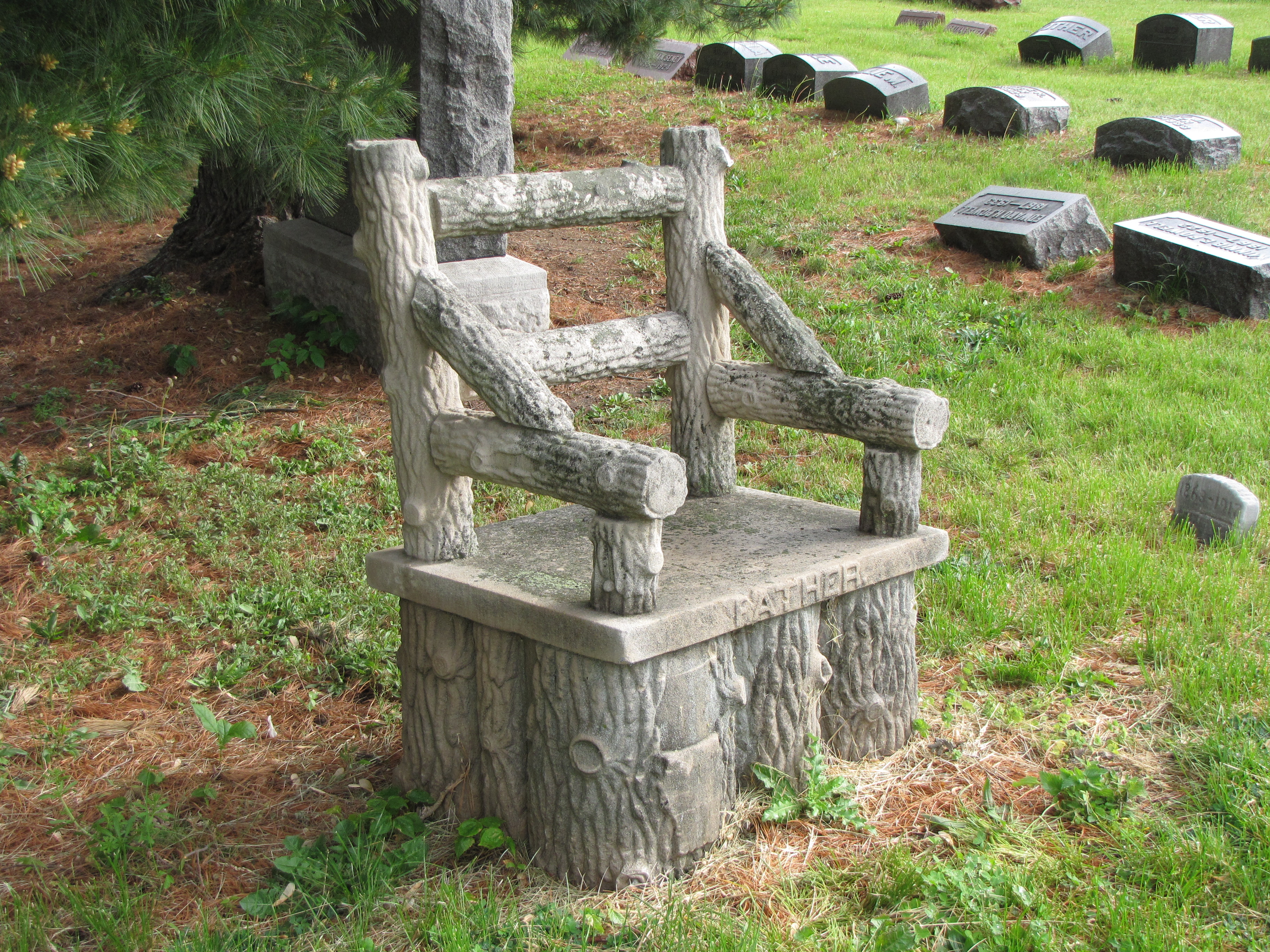 The variety found in the rustic movement tombstones is diverse.  In these three examples of the tree-stump chair, elegant and slim curved lines have given way to the bulkier and heavier forms made from pieces that came directly from the trees often with the bark still intact, eschewing classic designs.