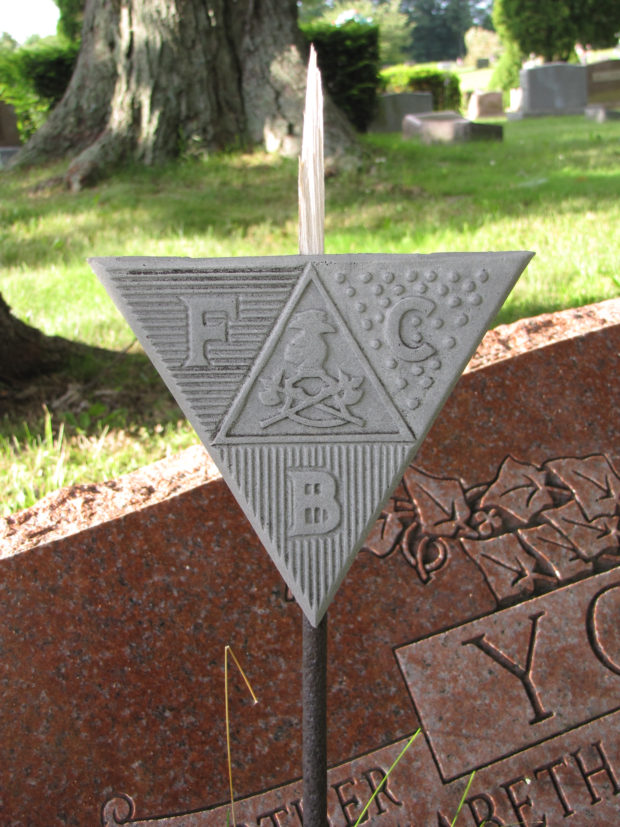 In the center triangle of the metal marker above are featured many of the symbols that are significant to the Knights of Pythias. The profile of a knight’s helmet, with a falcon (a symbol of vigilance) sits atop a shield surrounded by crossed battle axes, which represents the weapons that were used against their enemies. In the other three triangles are the three letters, “F”, “C”, and “B”, which stand for their motto, FRIENDSHIP, CHARITY, and BENEVOLENCE, .