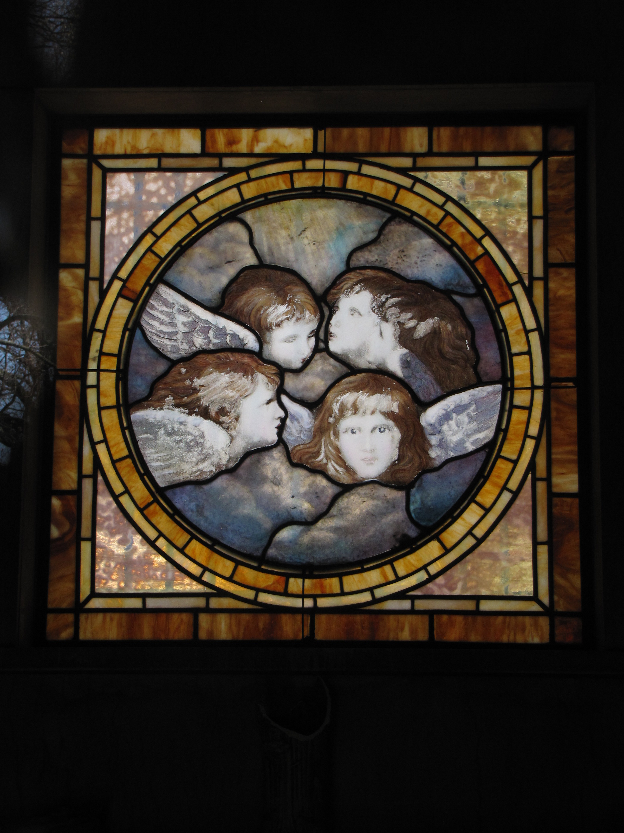 In this stained-glass window in the E.B. Cones and E.L. Patrick Mausoleum in the Crown Hill Cemetery at Indianapolis, Indiana, an array of cherubim–angels–are depicted. Cherubim are one of nine orders or choirs of angels which are organized into three spheres, with three choirs in each sphere. According to Christian tradition, the first sphere, which is made up of the Seraphim, Cherubim, and the Thrones, are considered the closet to Heaven. In Ezekiel 10:14, the Cherubim are described as having four likenesses or four faces, “And every one had four faces; the first face was the face of a cherub, and the second face was the face of a man, and the third the face of a lion, and the fourth the face of an eagle.” Cherubim are most always depicted as chubby babies.