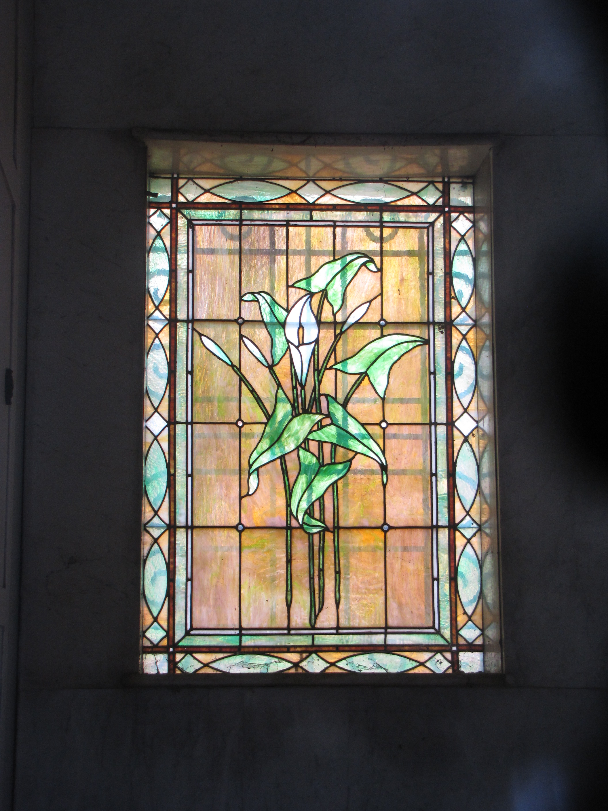 The stained glass window in this Crown Hill Cemetery mausoleum at Indianapolis features a single white calla lily in full blossom surrounded by three stems with buds. The calla lily is a stunner with its long slender stem, brilliant white flowers, and broad leaves. Though it is called a lily it is actually not in the flower family liliacea.