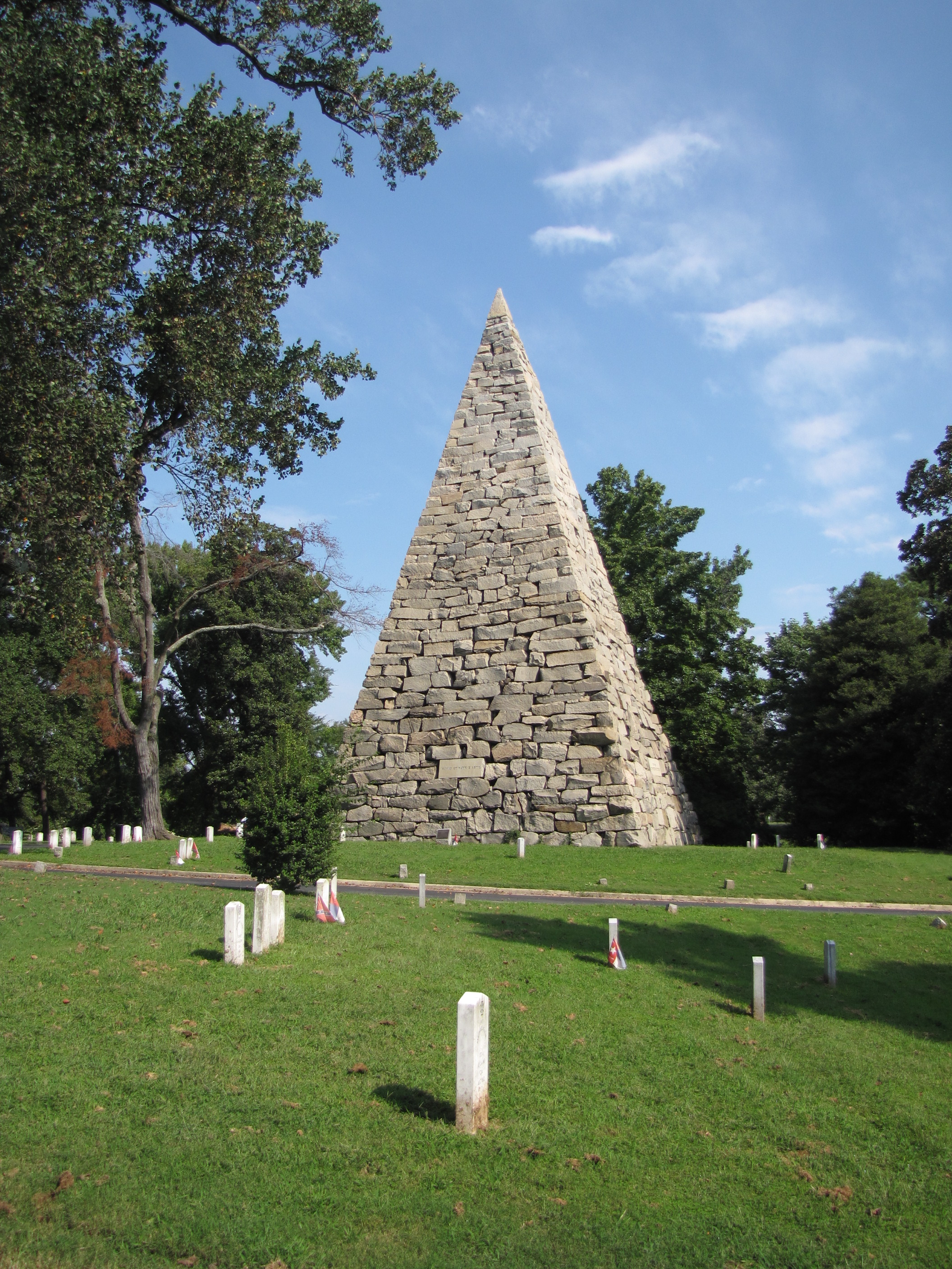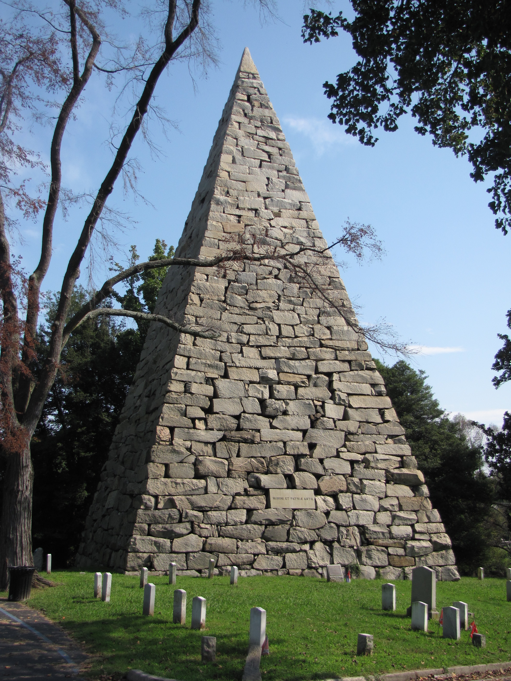 Most likely the largest pyramid found in an American cemetery is the pyramid dedicated to the 18,000 Confederate war dead in the Hollywood Cemetery at Richmond, Virginia. Designed by Charles H. Dimmock, a civil engineer of the Confederate Army, it has a base of 45 square feet and a height towering at 90 feet tall. The pyramid is built from granite stones pulled from the nearby James River. The pyramid was begun on December 3, 1866, and built by prisoners in just short of three years—the capstone was laid into place on November 8, 1869. The pyramid encapsulates several artifacts that were dear to Confederate soldiers, including a button from General Stonewall Jackson’s coat, a Confederate flag, and a lock of President Jefferson Davis’ hair.