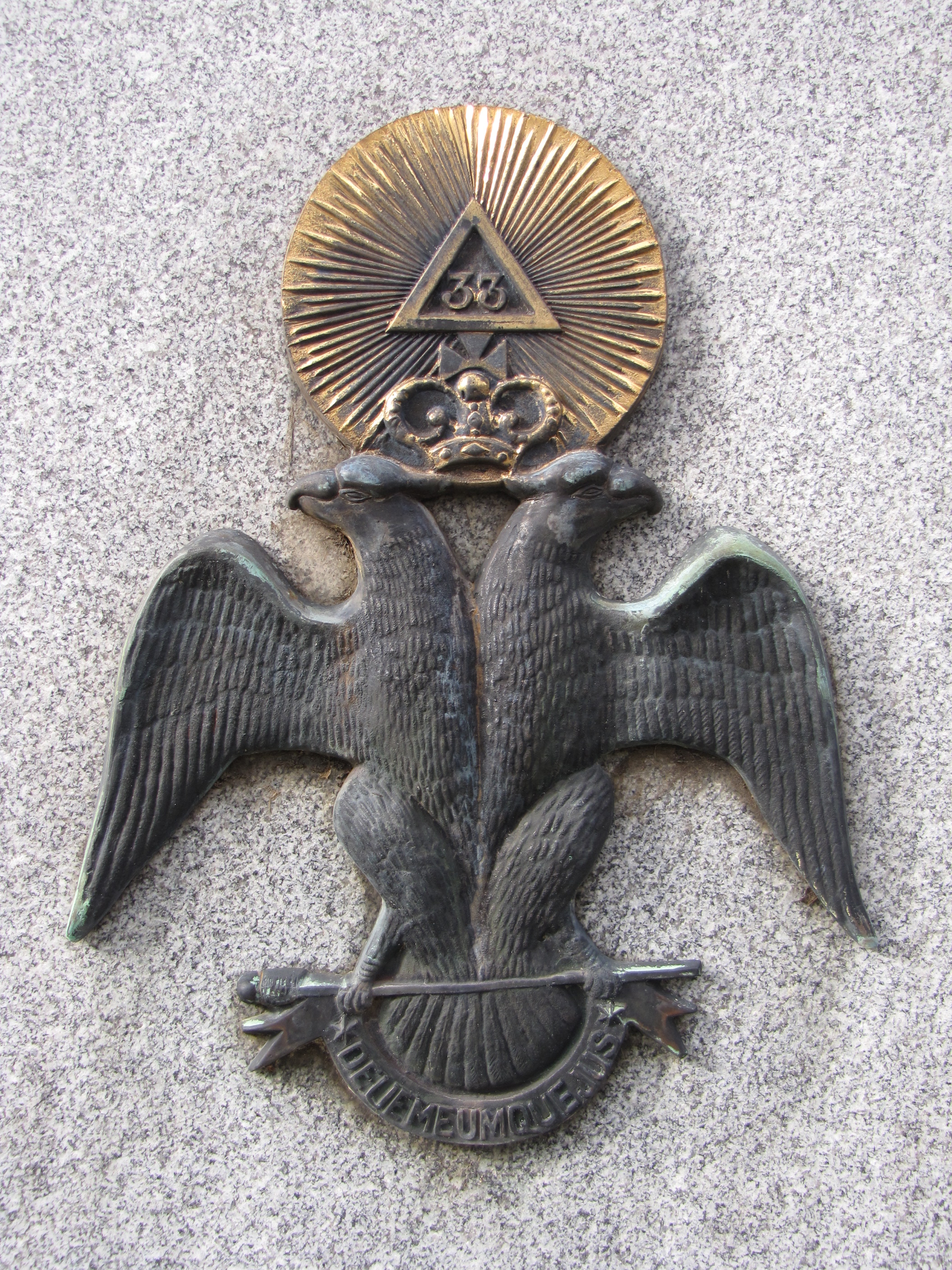 The double-headed eagle was adopted by the Scottish Rite for use by the 33rd Degree Masons. In this image found in the Lakewood Cemetery at Minneapolis, Minnesota, the body of the double-headed eagle is copper with the crown and the radiating medallion above cast in brass. The eagle clutches a banner with the Latin phrase, “DEUE MEUMQUE JUS”, meaning, “God and my right”.