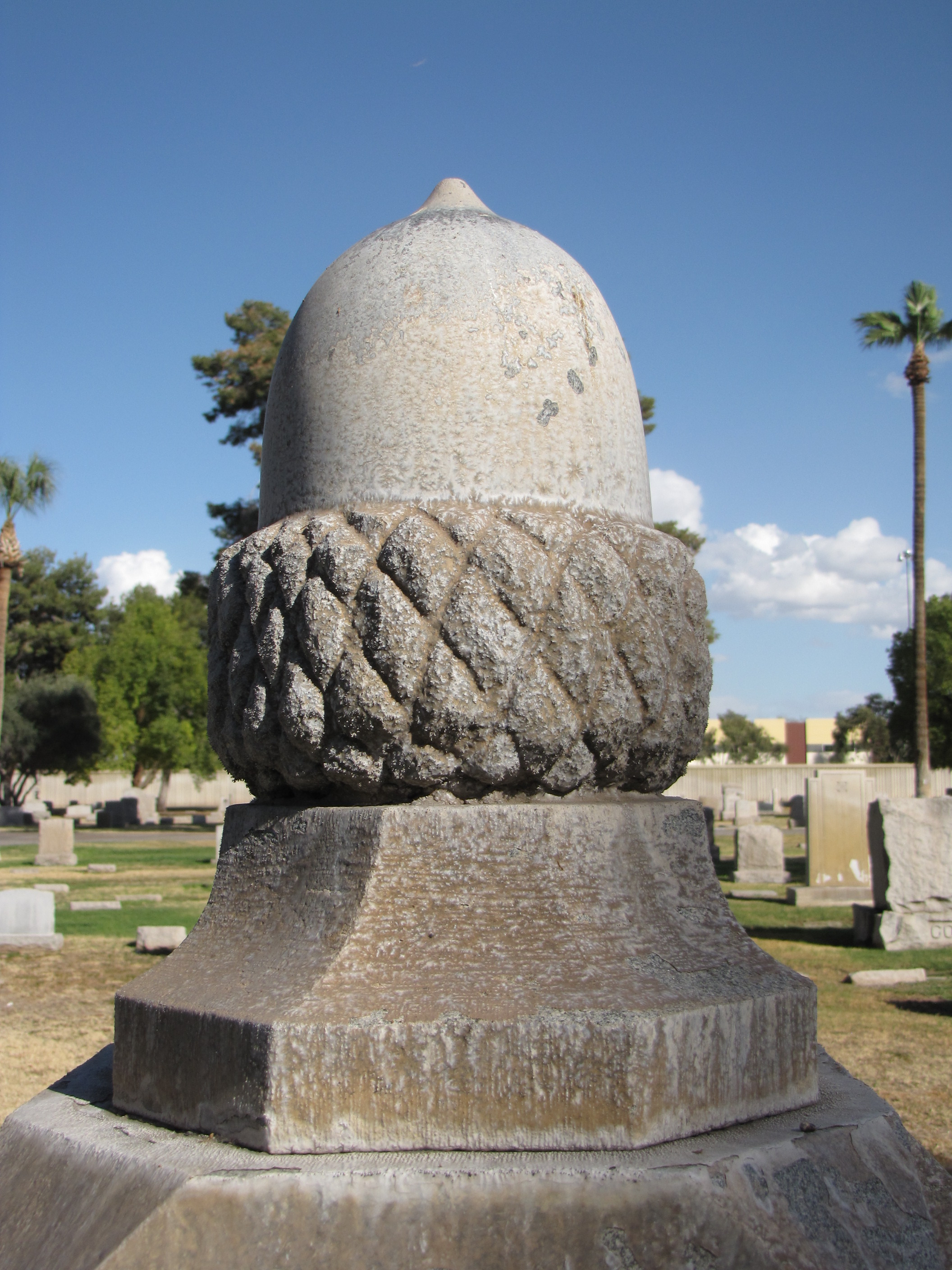 Sitting on top of this gray granite gravestone in the Greenwood Cemetery at Phoenix, Arizona, is a large acorn, turned upside down. The acorn, seed of the mighty oak, is a symbol of prosperity and fruitfulness. When the acorn is paired with oak leaves it is seen as a traditional symbol of strength. The single acorn can represent a kernel of truth born into spiritual growth. Twin acorns can represent male sexuality. Two acorns can also represent truth and power of the Holy Spirit. The former is revealed in the Earthly realm and the later after entering the Heavenly realm.