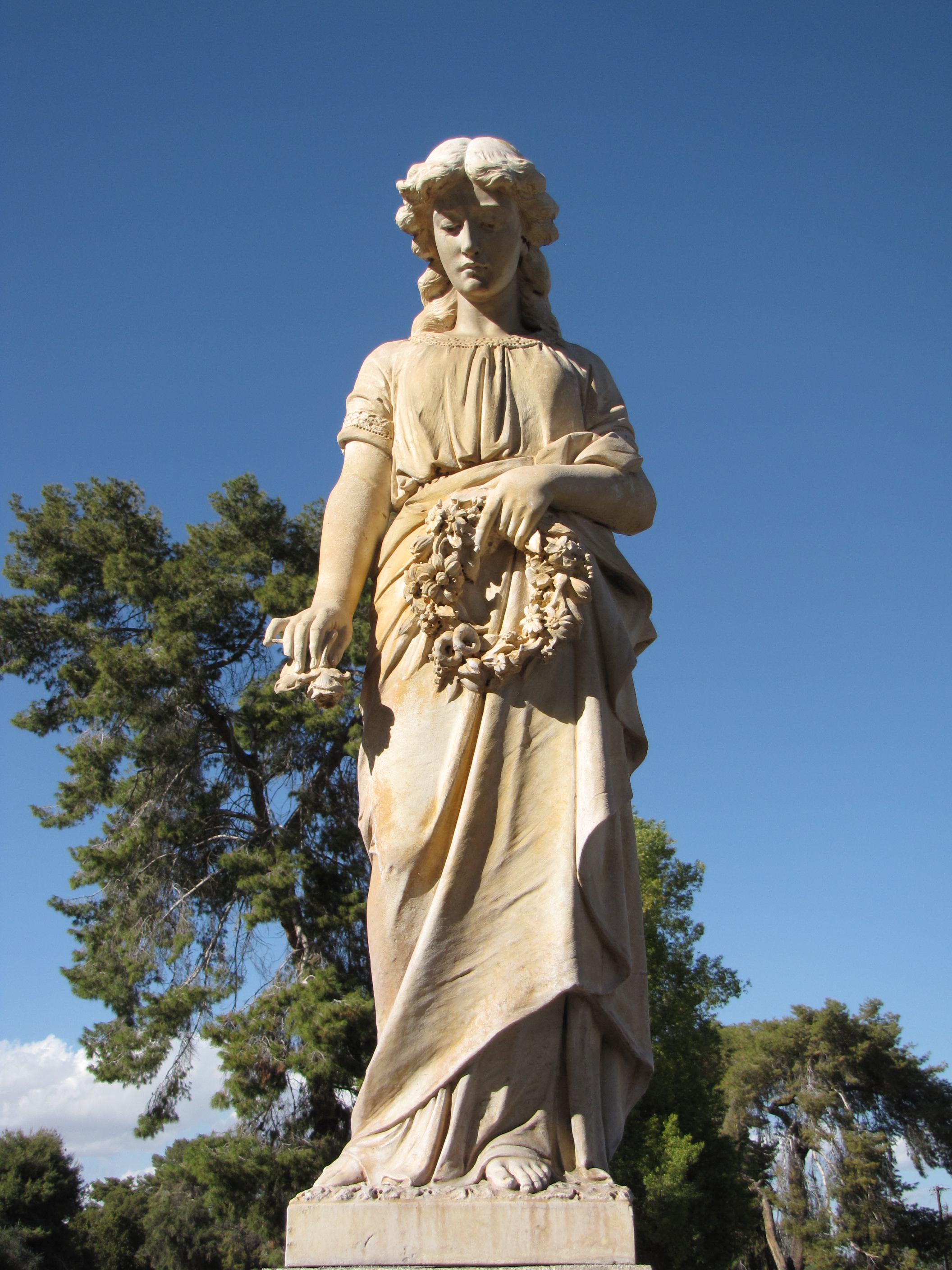 The monument for the Beck family in the Greenwood Cemetery, at Phoenix, Arizona, has atop it a young female figure. Her head is bent forward, she is looking down in reflection and sorrow, while she is holding a rose bloom in one hand and clutching a floral wreath in the other. This is a common Victorian funerary symbol expressing the transitory nature of life.
