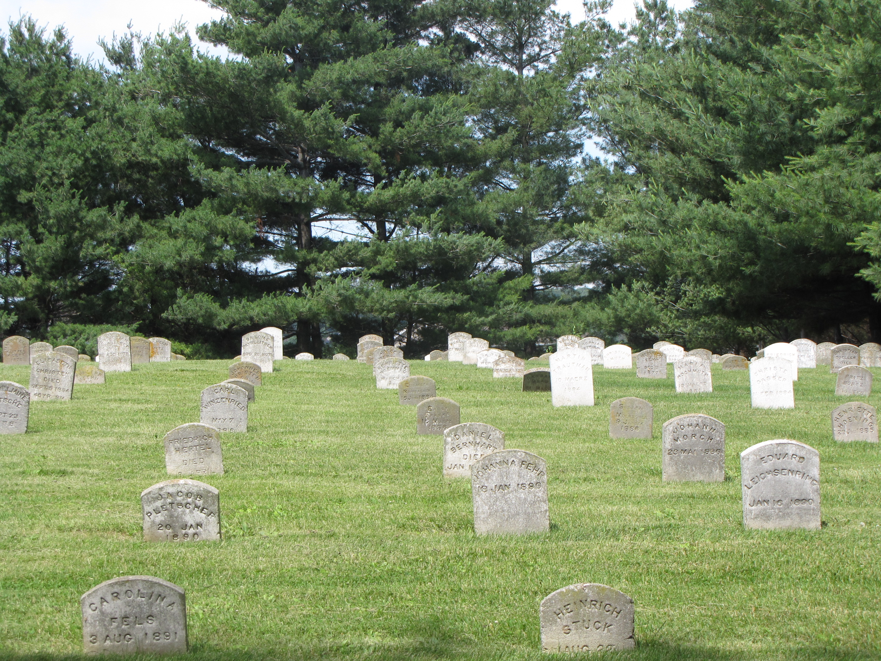 The straight upright rows of same-shaped gravestones look like they are located in a military graveyard—but they are not. These gravestones are in a tiny graveyard at “Main” Amana, Iowa, one of the seven villages founded by a communal German religious group of Pietists known as the Community of True Inspiration. Each person is buried in order of their death–NOT next to their families in family plots. Each person receives a concrete segmented-top gravestone of the same shape and construction.