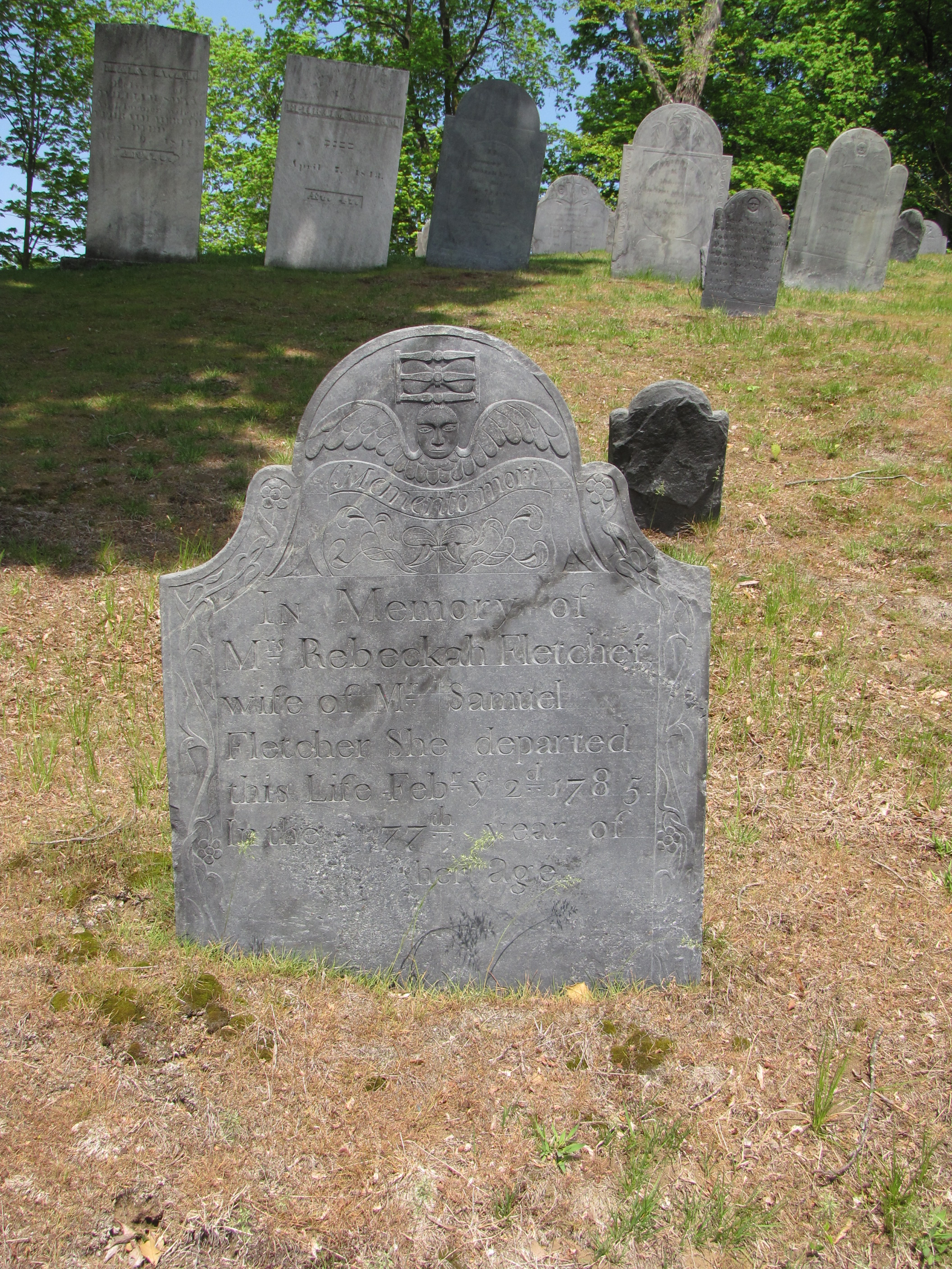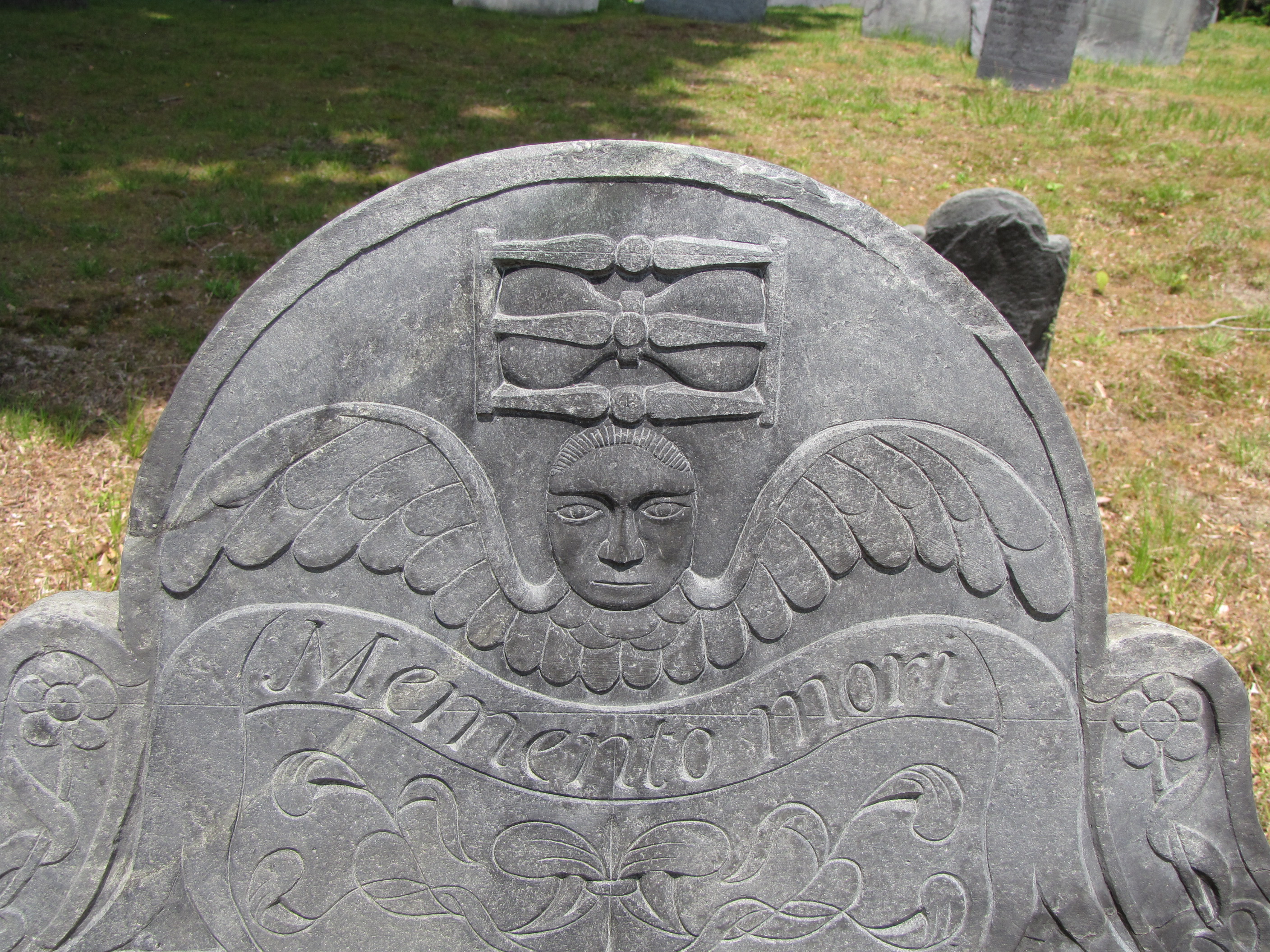 The winged cherub was a symbol that became popular in the 18th Century. Winged cherubs replaced the stark and morbid flying death’s heads from our Puritan forefathers. The cherubs often have a childlike countenance of innocence. The “cherub” on Mrs. Fletcher’s gravestone looks stern and a bit foreboding. The iconography represents the flight of the soul from the body upward to Heaven and the hope of the resurrection. In this motif the wings give flight not only to the soul but to time.