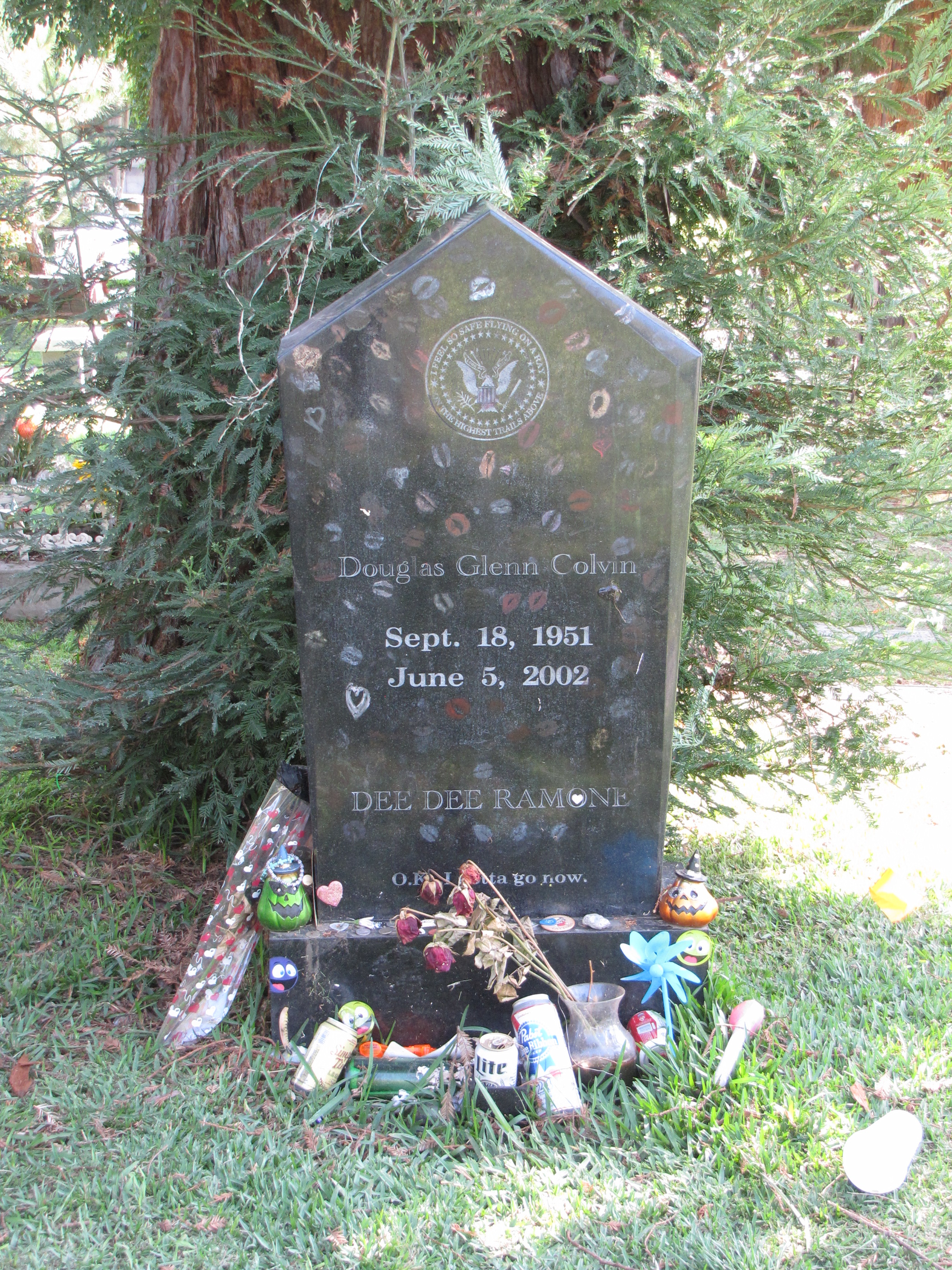 Dee Dee Ramone /Douglas Glenn Colvin (September 18, 1951 – June 5, 2002), was a songwriter and bassist for the Ramones. Dee Dee Ramone died of a drug overdose and was buried in Hollywood Memorial Park Cemetery.