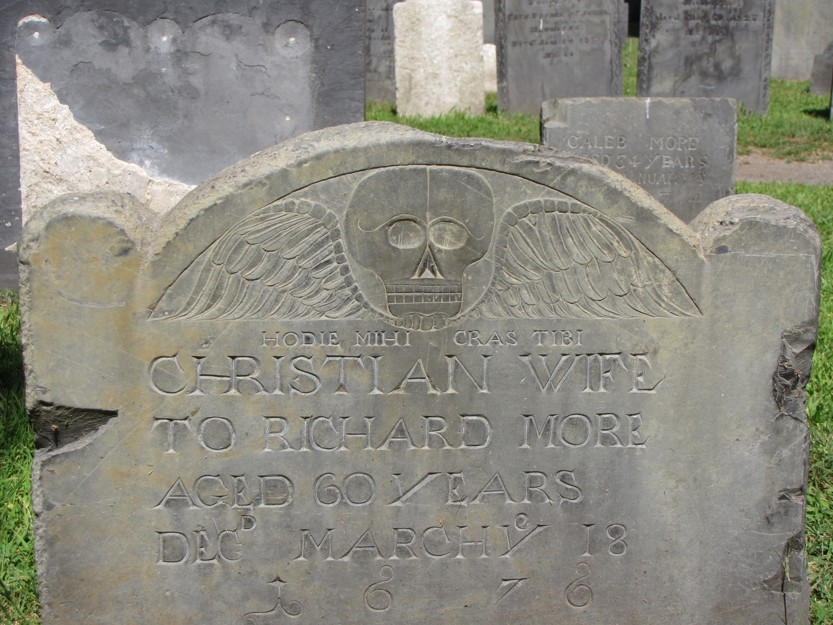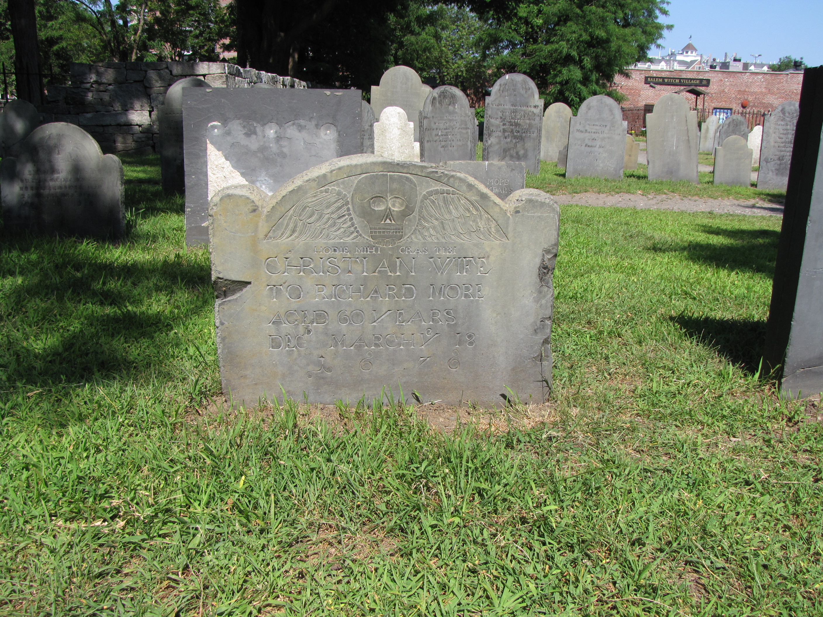 Two things strike me immediately about this gravestone in Burying Point, the first place set aside in Salem, Massachusetts, in 1637, for burials. First, we don’t know the name of Richard More’s wife—only that she was a Christian wife to him.