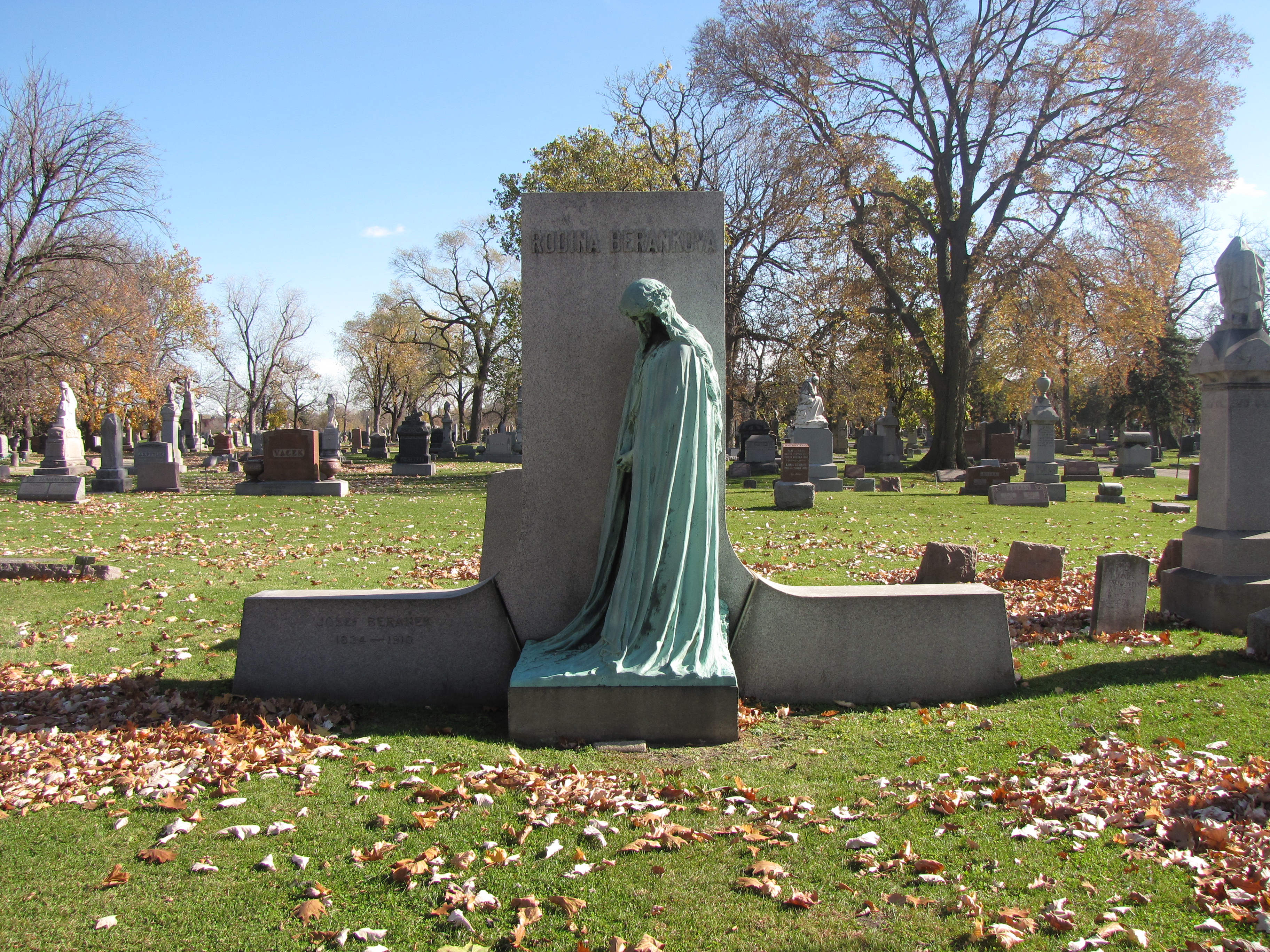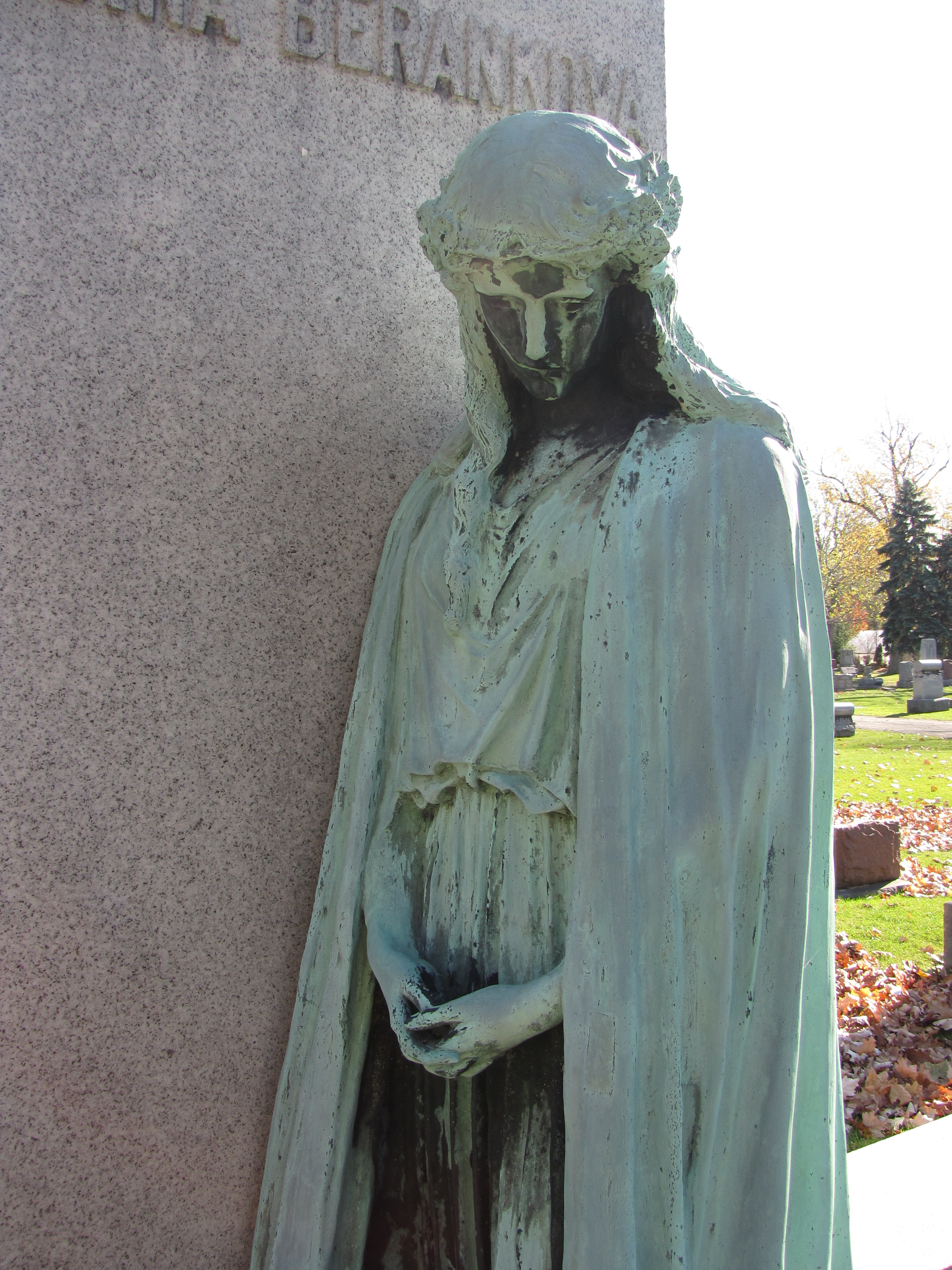 The figure stands in front of a large sweeping gray granite gravestone with the words “RODINA BERANKOVA” carved into the stone. “RODINA” is Czech meaning “family”. An inscription on the left side of the monument notes Emanuel’s father’s inscription: “Josef Beranek 1834 – 1910.”