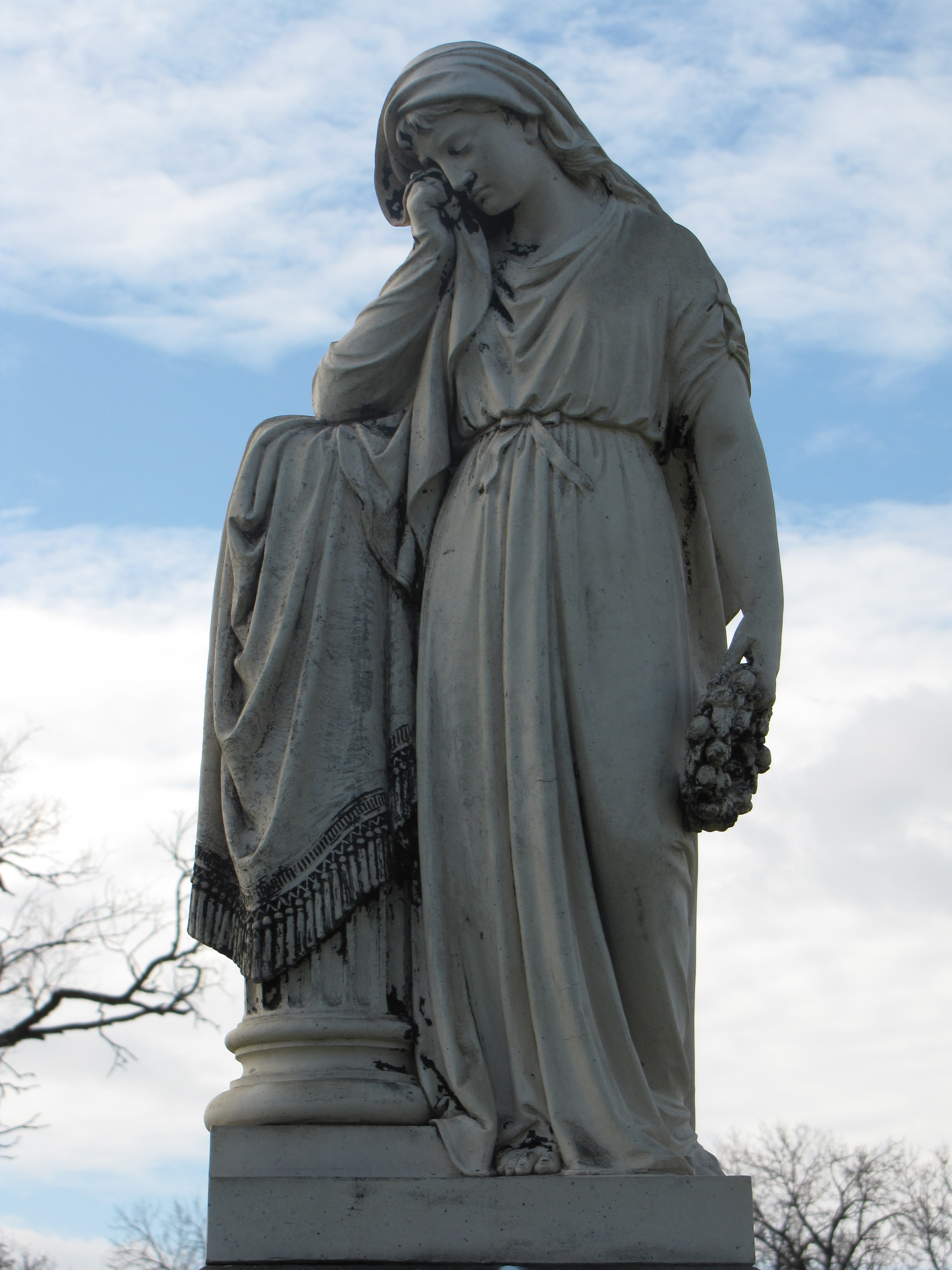 This statue in the Bohemian National Cemetery at Chicago, Illinois, is replete with rich symbolism. The mourning figure tenderly wipes her eye with the corner of the funeral pall in a sign of grief. She gently leans against a broken column in sorrowful resignation. The column represents a noble life cut short and the drapery represents a shroud symbolizing death and sorrow. The drapery can also be a motif that represents a veil that separates the Earth and Heaven. In her other hand she holds a wreath which can be traced back to ancient Roman times representing victory. In funerary art, it symbolizes victory over death through immortality.