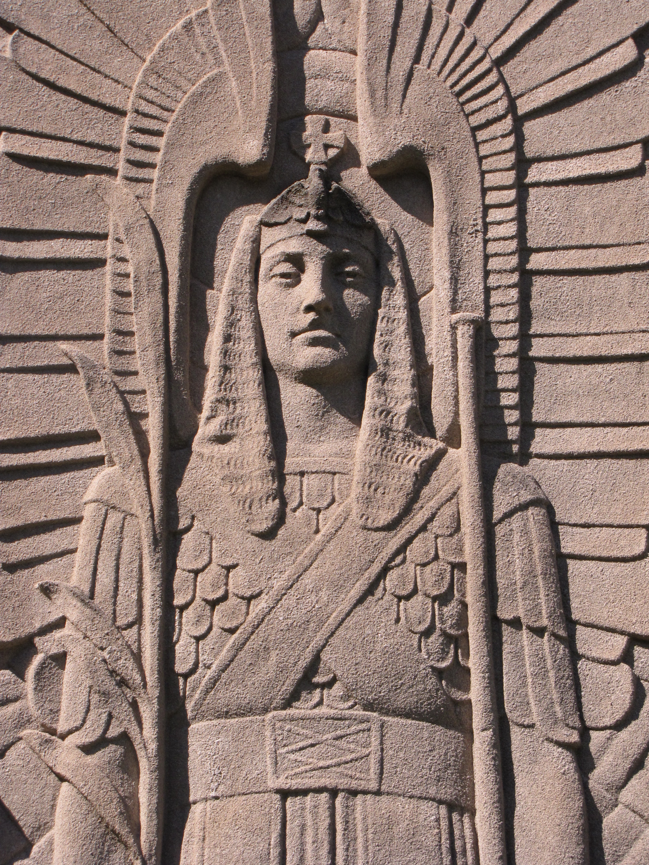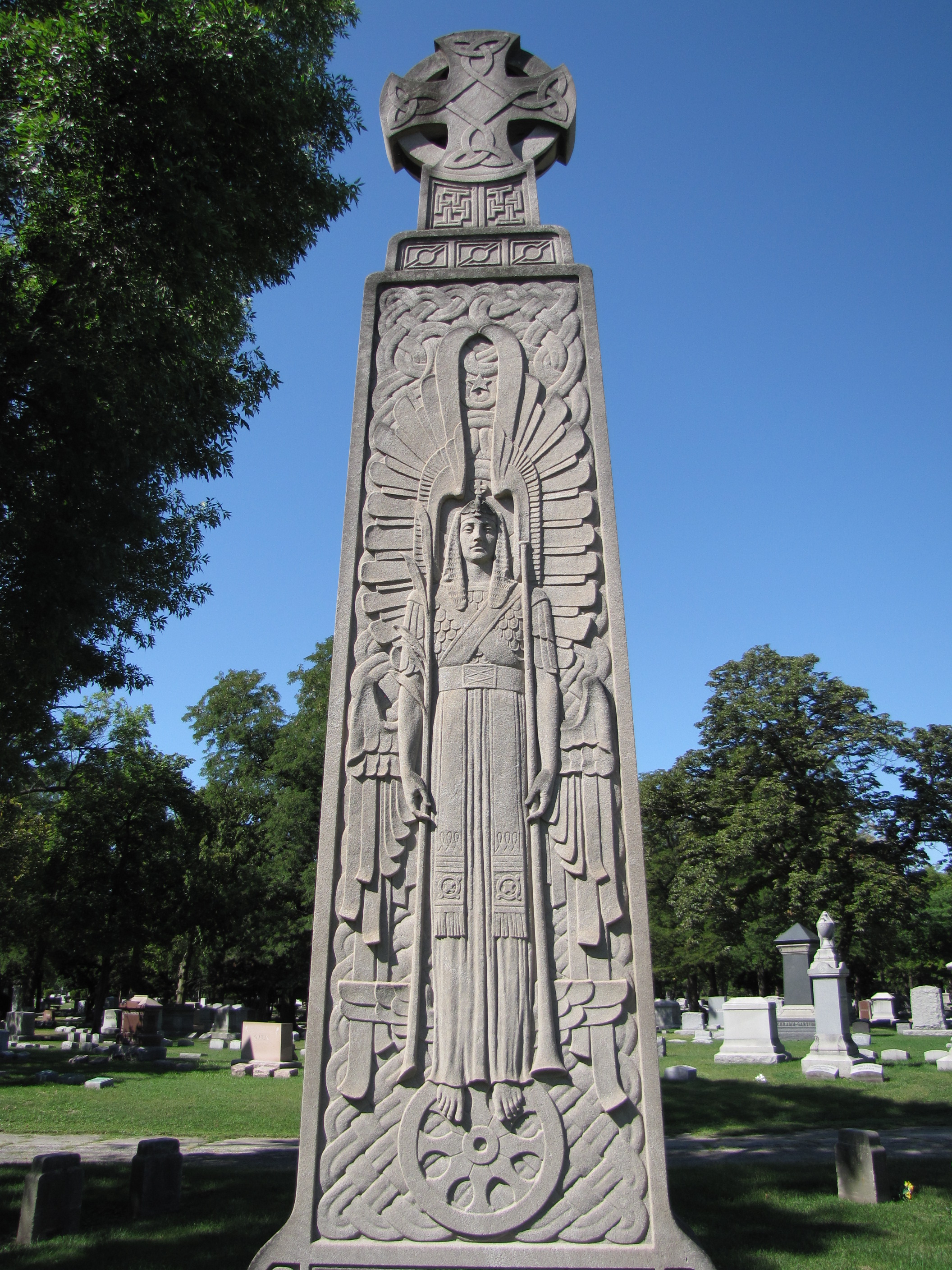 The bas-relief angel carved into the soaring Celtic cross marks the graves of Edmund Cummings and his wife, Ellen. The monument is a testament to Edmund’s success as a Chicago businessman. This Art Deco design with the angel standing on a wheel may be a reference to Ezekiel’s vision described in the Bible: