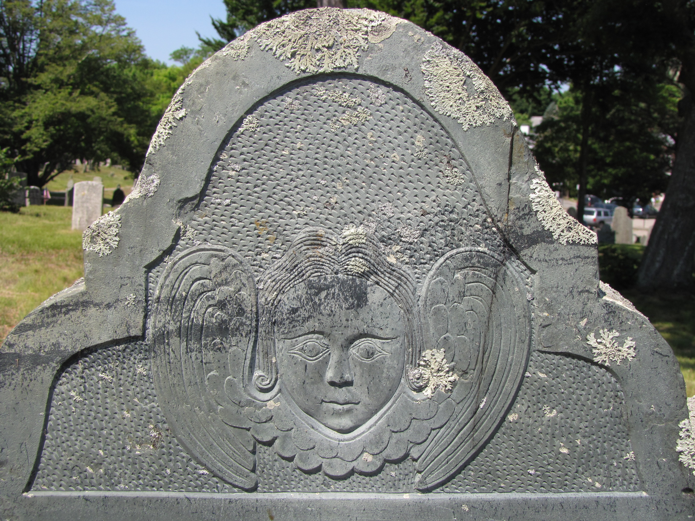 The gray slate gravestone of Mrs. Sarah Morton displays a youthful looking soul effigy, or winged cherub. The wings curve down framing the face and the eyes stare blankly forward. Here, the young bride of only 23 years old is buried on Burial Hill at Plymouth, Massachusetts, the home of the Mayflower passengers and their descendants.