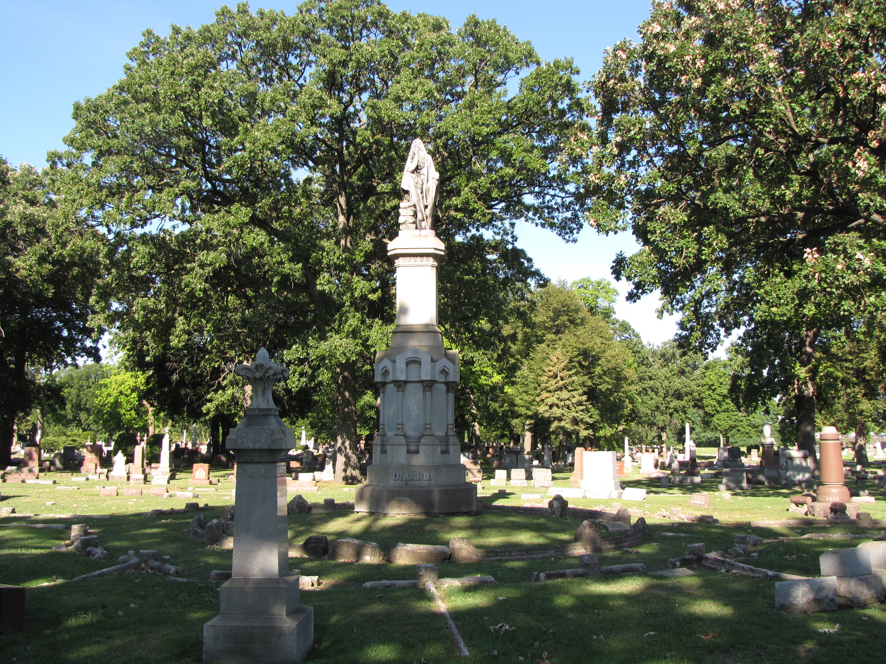 Merlin can be found perched high atop a monument in the Forest Home Cemetery at Forest Park, Illinois, a suburb of Chicago. This is the centerpiece monument in a circle of burials of members of the United Ancient Order of Druids. The United States branch, or grove, was founded in the United States in 1830 at New York. From there it spread across the country gaining members as far west as California.