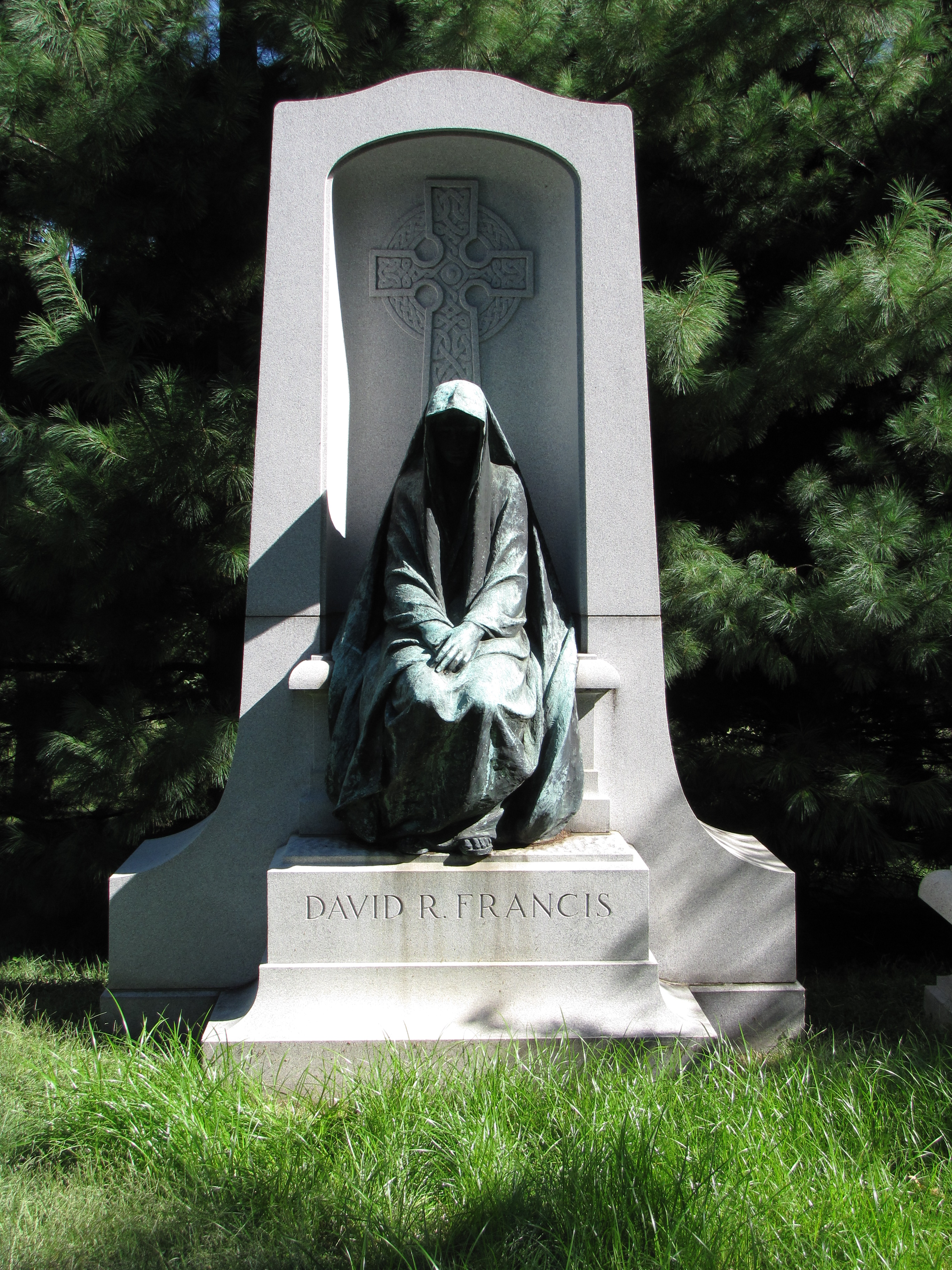 I had taken a picture of David Francis’s grave stone and that haunting woman years ago. Francis was quite a well-known figure in St. Louis. Bellefontaine Cemetery is famous for a wonderful collection of sculptures commissioned by the most important St. Louis families years ago. The Clydesdales of Budweiser fame were originally brought to St. Louis to pull huge monuments, stones, and granite blocks from the river to the cemetery.