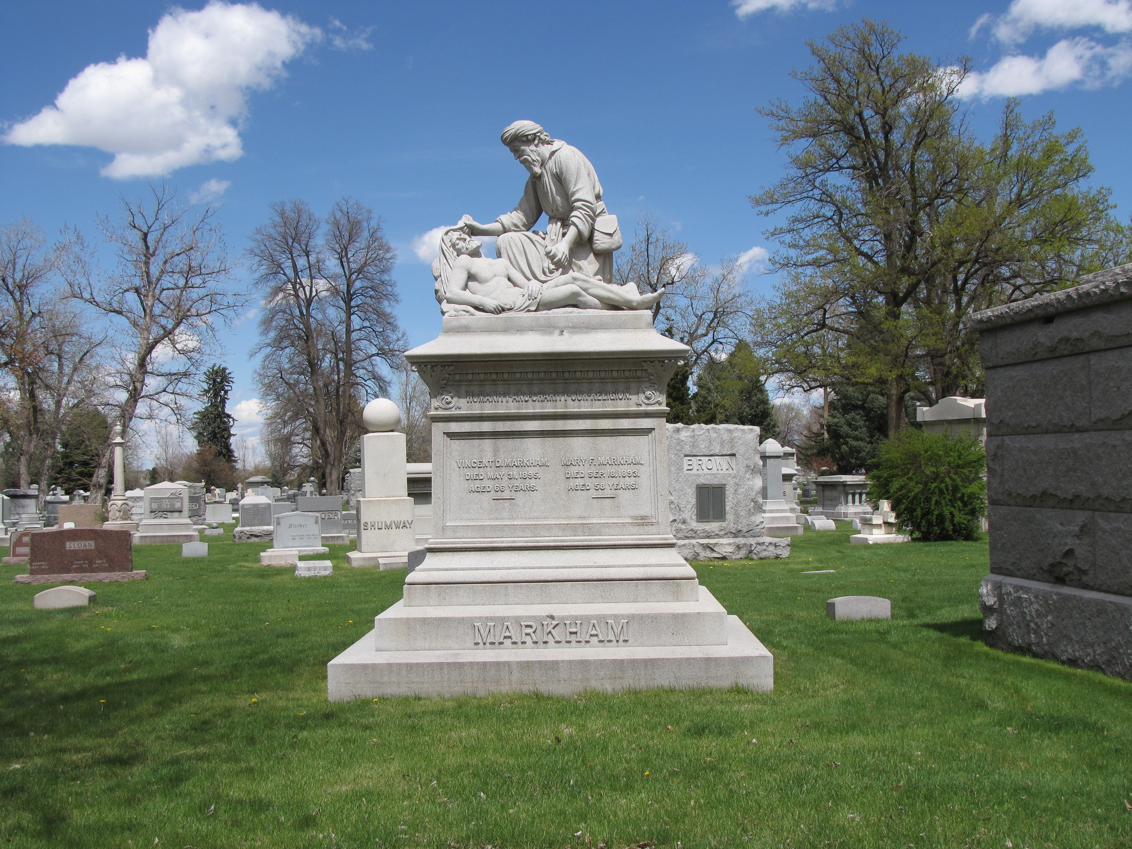 That story is illustrated in stone upon the monument for Vincent and Mary Markham in the Fairmount Cemetery at Denver, Colorado. Neither of them, however, chose it for themselves. Vincent had a clause in his will that his executors should choose an appropriate monument to honor him and his wife, Mary. It also needed to display in some way, their values, which, in part, are carved in the stone, “Humanity and Charity are our Religion”.