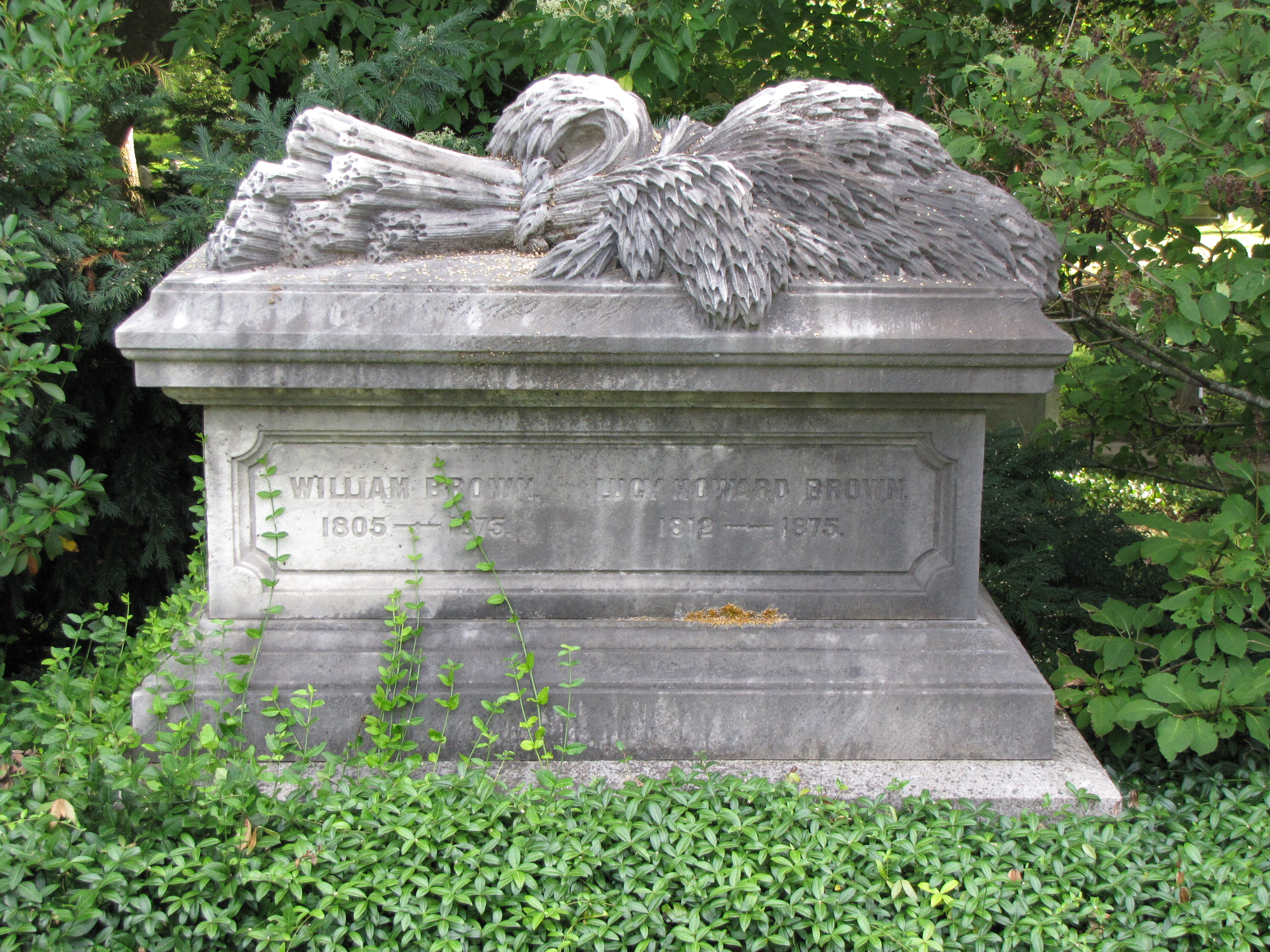 Carved on top of the William and Lucy Howard Brown white marble sarcophagus is a great shock of wheat. Wheat’s origins are unknown but is the basis of basic food and a staple in many cultures. Because of wheat’s exalted position as a mainstay foodstuff, it is viewed as a gift from Heaven. Wheat symbolizes immortality and resurrection. But, like many symbols found on gravestones, they can have more than one meaning. For instance, because wheat is the main ingredient of bread, the sheaf of wheat can represent the Body of Christ. Wheat can also represent a long life, usually more than three score and ten, or seventy years.