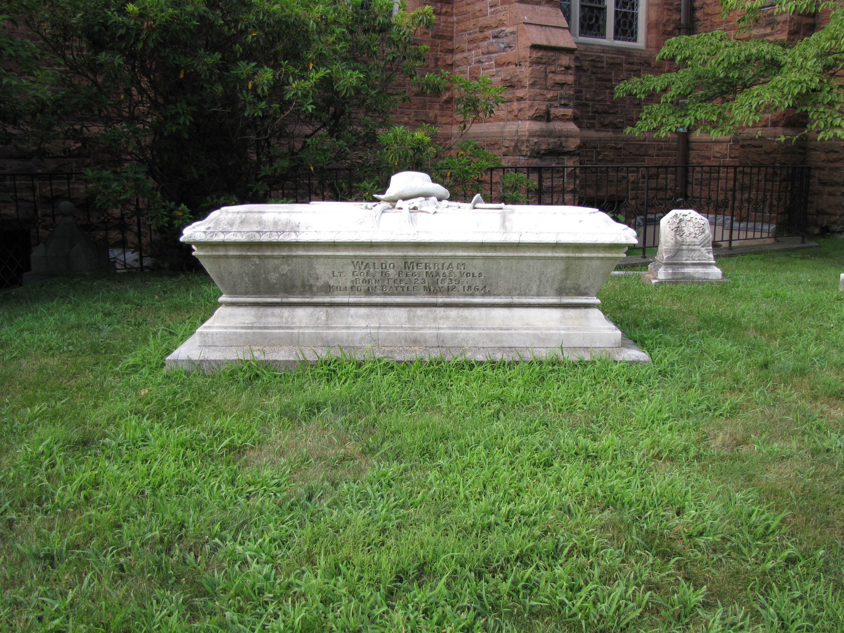 This white marble sarcophagus was built for Waldo Merriam, a soldier who was killed in a battle. The top of the monument features the soldier’s hat and sword.