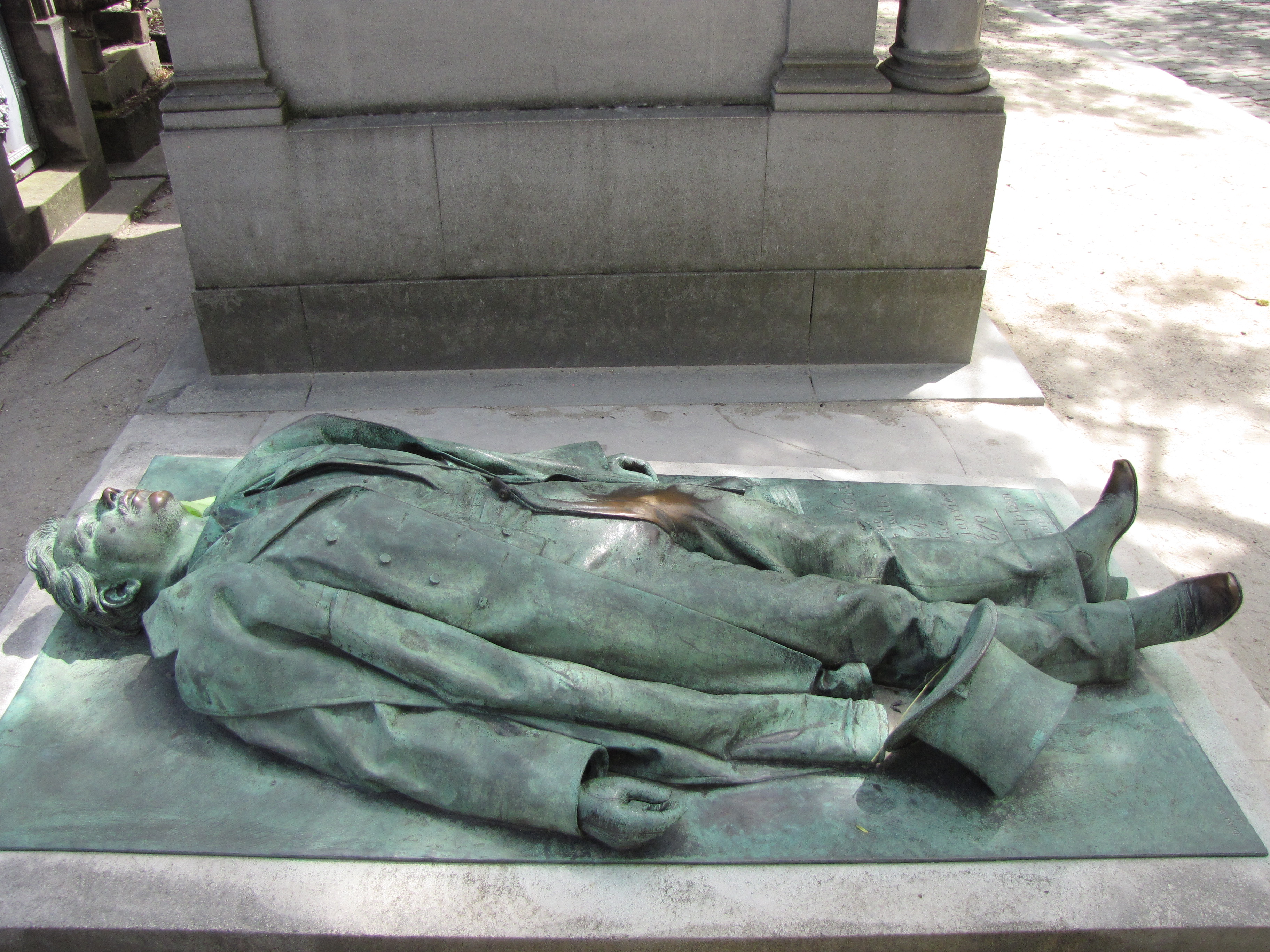 The monument to the fallen hero is that of a fallen man. Victor Noir is depicted laid out flat, top hat next to him. Dalou sculpted Noir, as was his practice, very realistically. But the folds in Victor’s trousers make it appear as if he has an erection or at the very least, is a very well-endowed man. A myth grew up around the statue that if a woman kissed his lips and rubbed his “talisman” they would be rewarded with fertility and a better sex life. Some versions of the myth promise single women marriage within a year if the women also leave a flower in his hat.