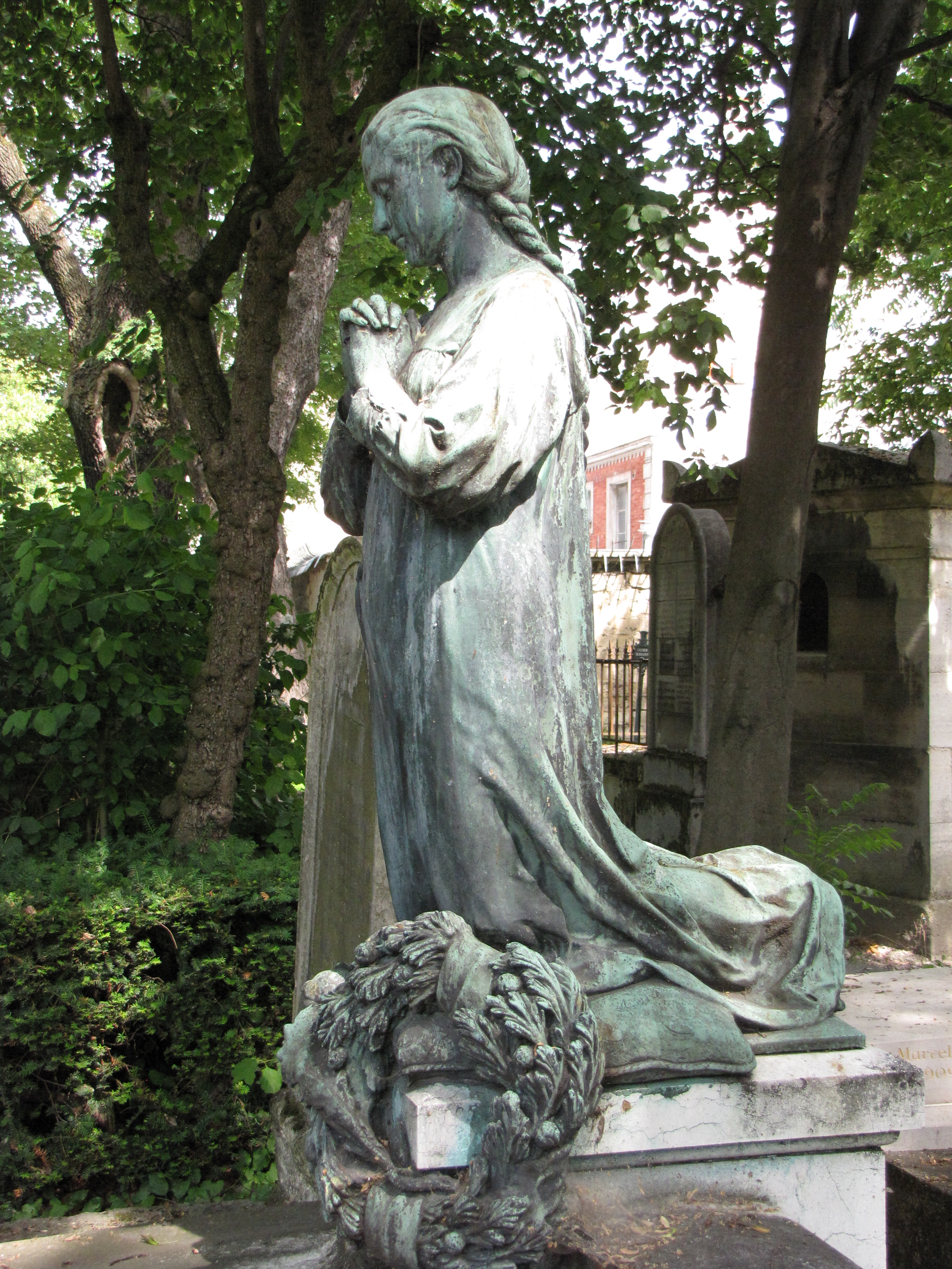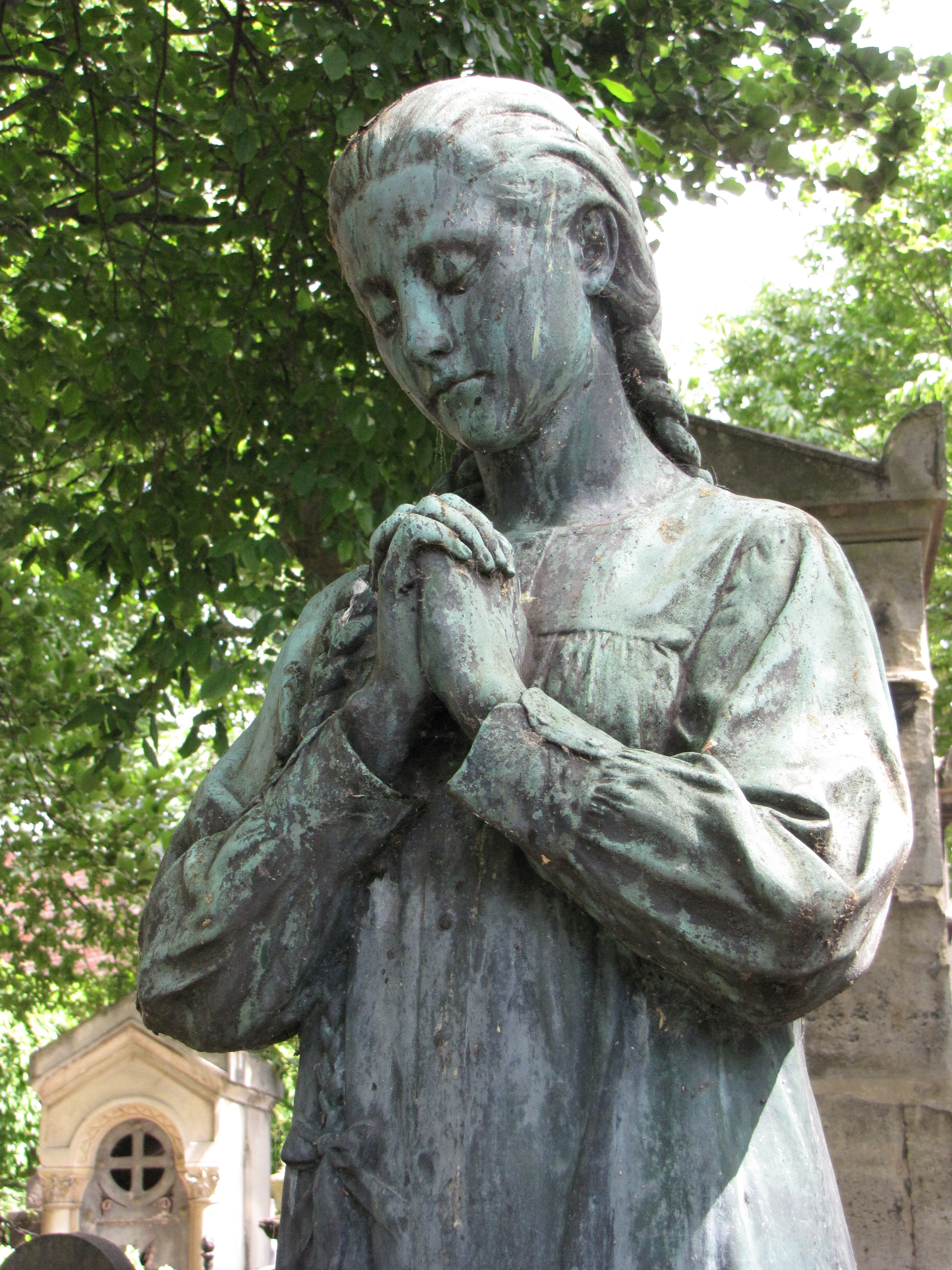 The best way to assure that you get what you want on your tombstone is, of course, to do it yourself, which is exactly what famed French sculptor Henri Emile Allouard did. He sculpted a magnificent bronze of a young girl dressed in a sleeping gown kneeling on a pillow as she prays. There is a wreath that drapes the end of the pillow. The bronze is atop of his family tomb in Le Père Lachaise at Paris, France.