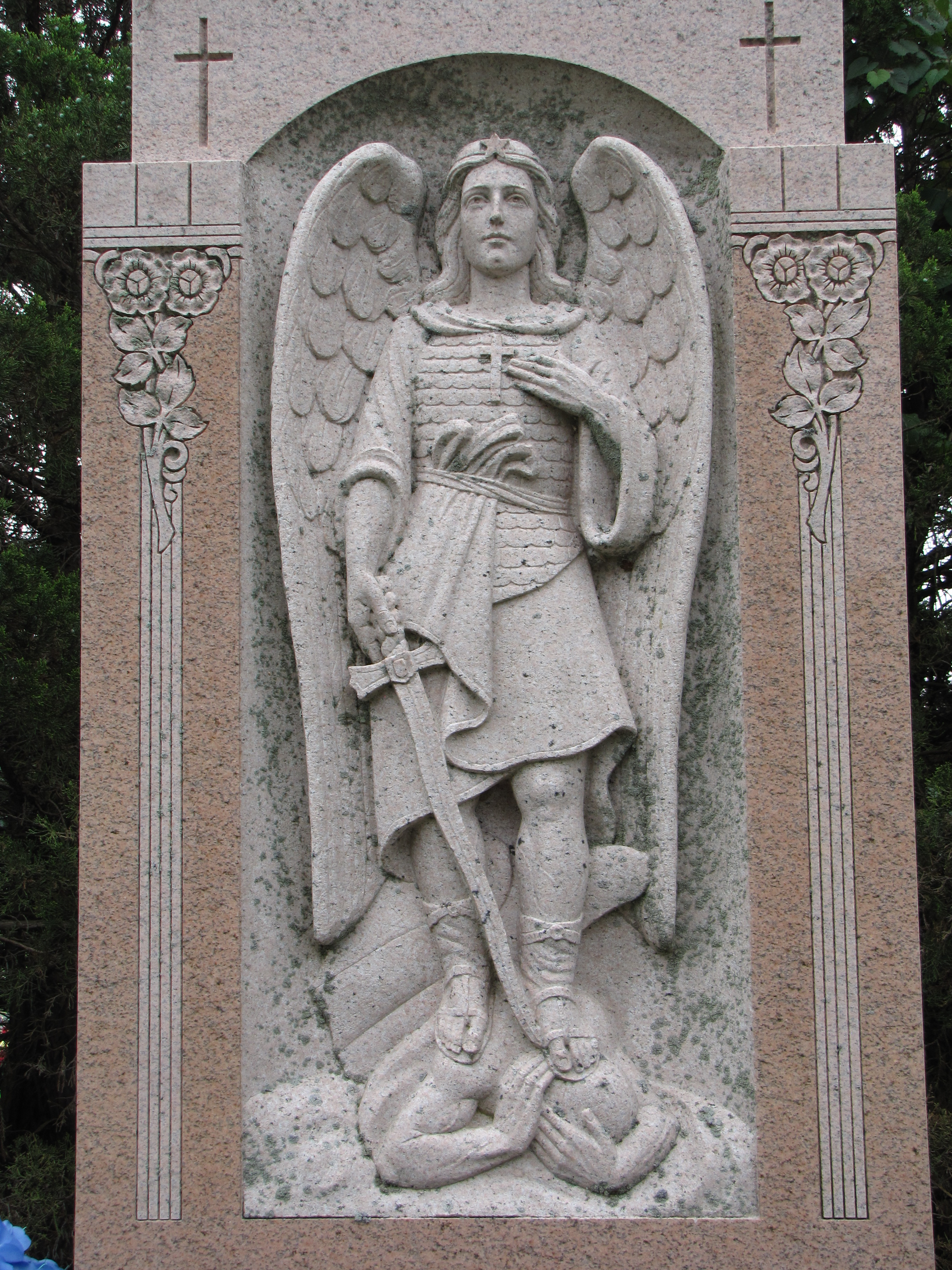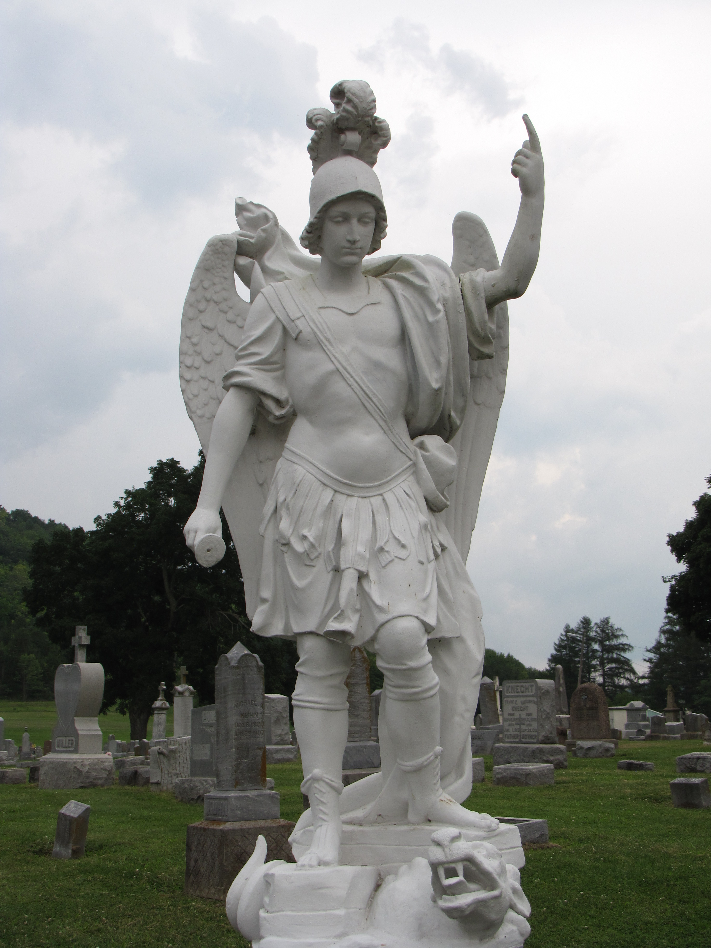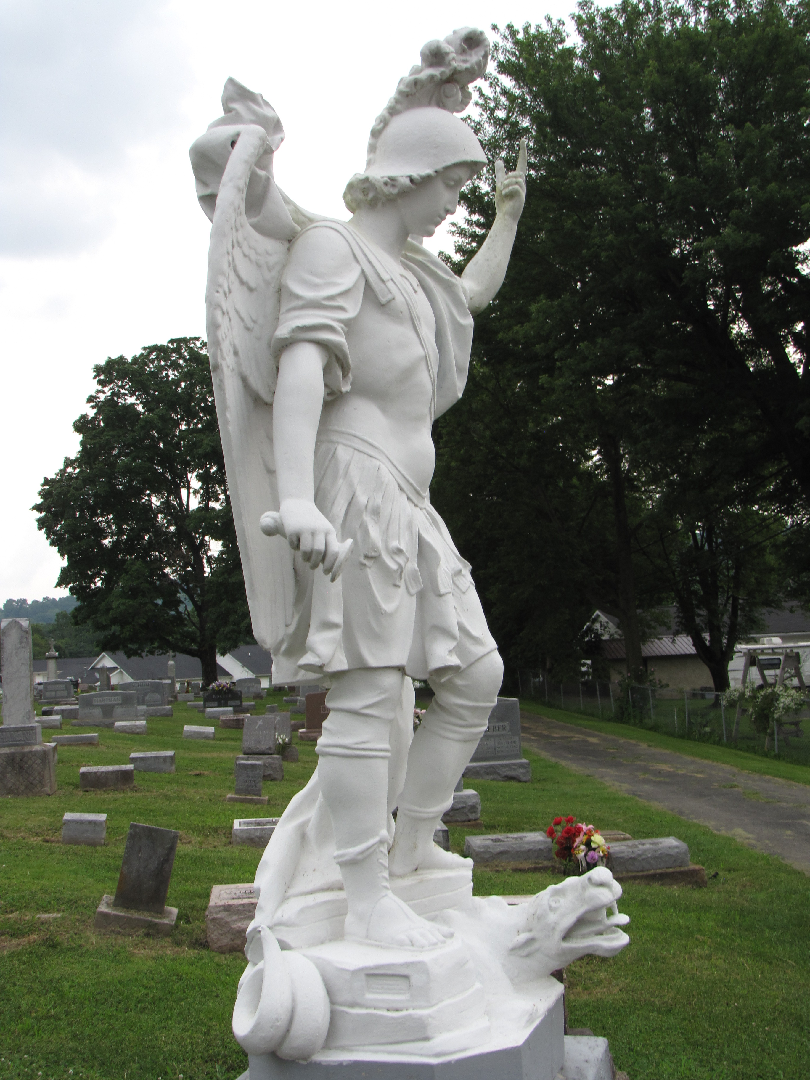 St. Michael’s Cemetery in Brookville, Indiana, features two sculptures of St. Michael. The deep bas-relief statue at the entrance of the cemetery is made of a polished and unpolished red granite giving the statue a duo-tone effect. Here St. Michael stands on the back of the devil himself who is holding his head in agony. This statue represents the triumph of good over evil.
