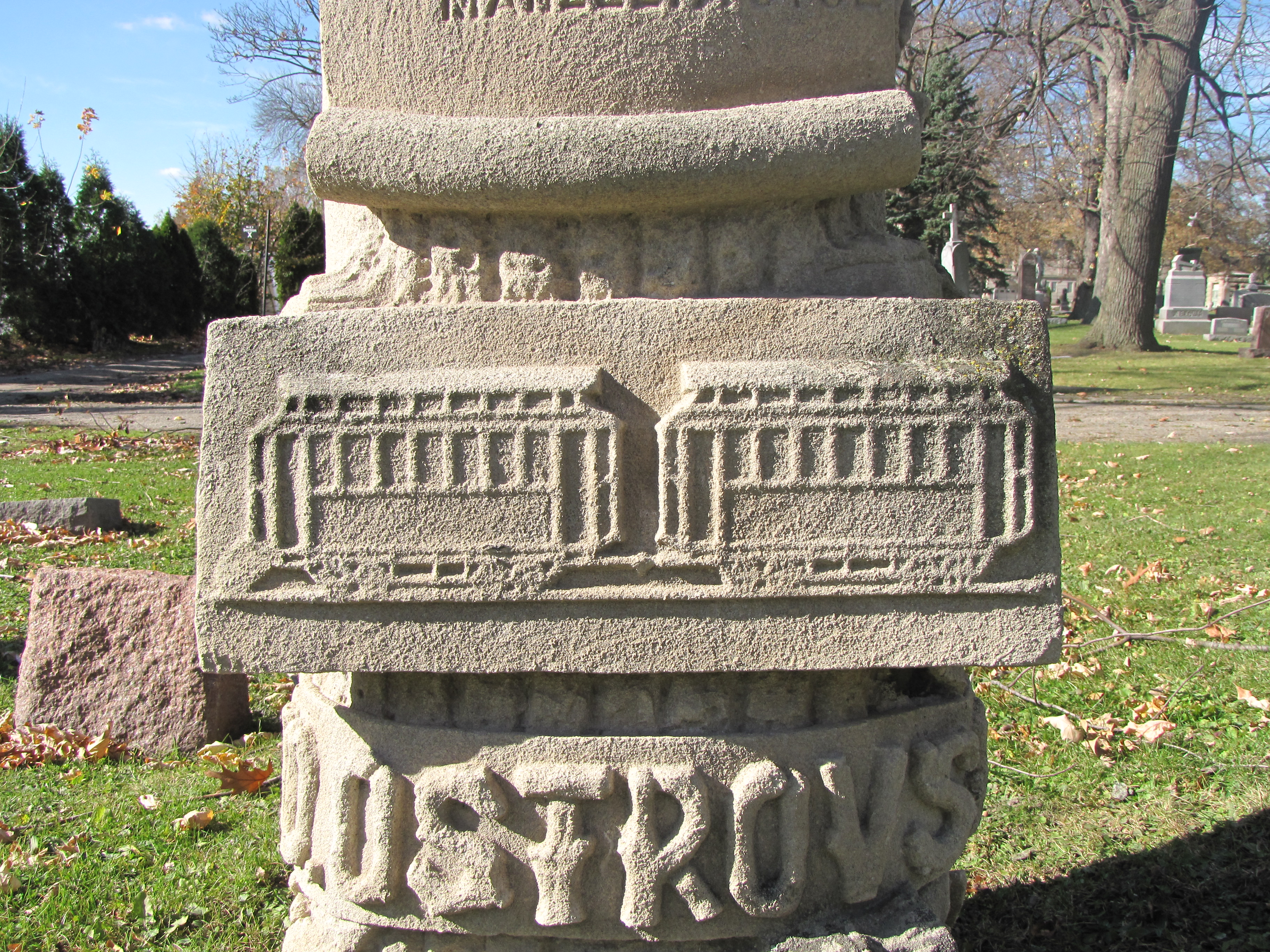 But what is different is the bas-relief on the front that displays the scene of his death. It shows the two trolley cars. Above the panel, carved to look like a scroll with the tombstone’s inscription, is a faded photo of Frank Ostrovsky, husband and father.