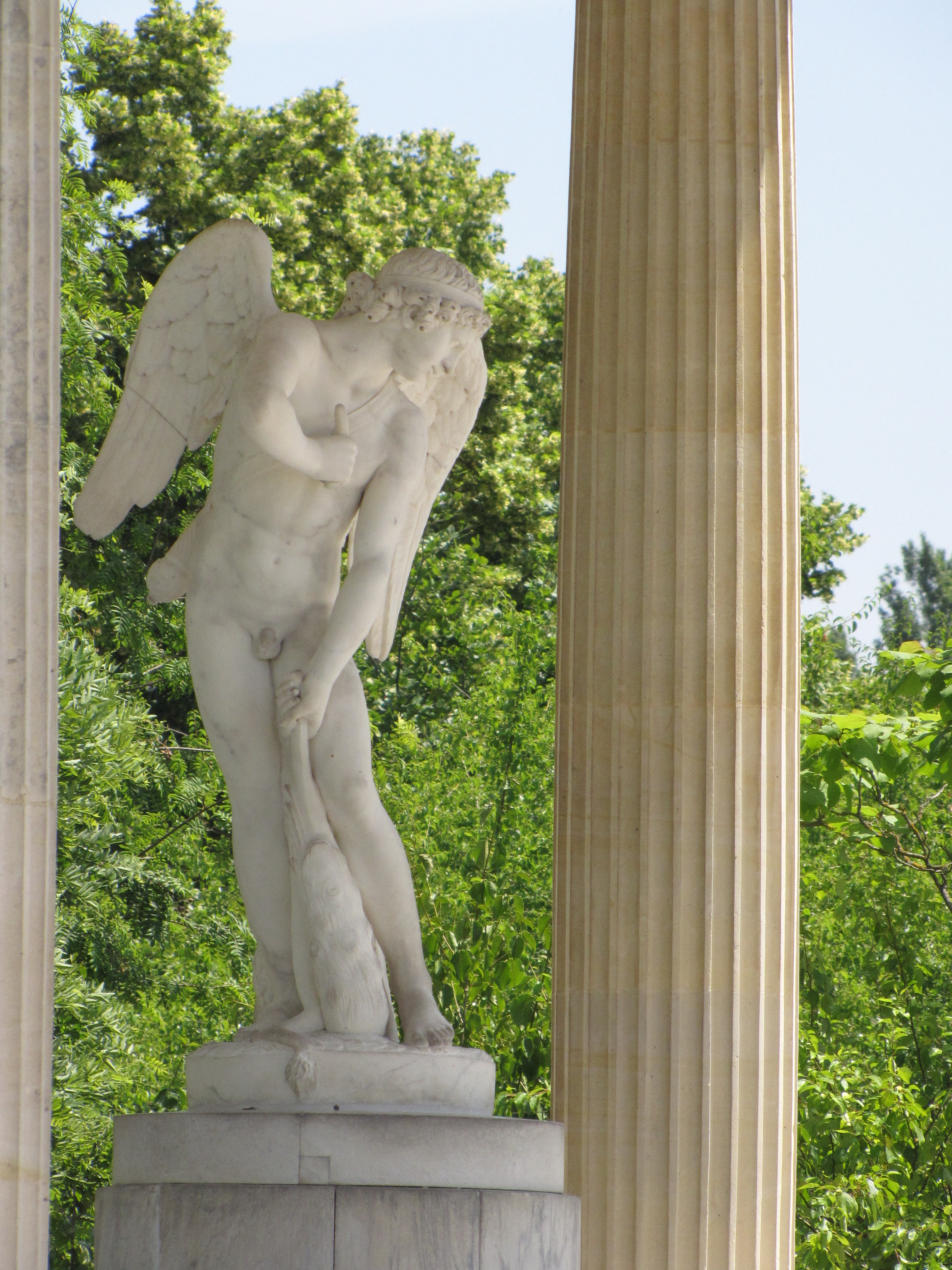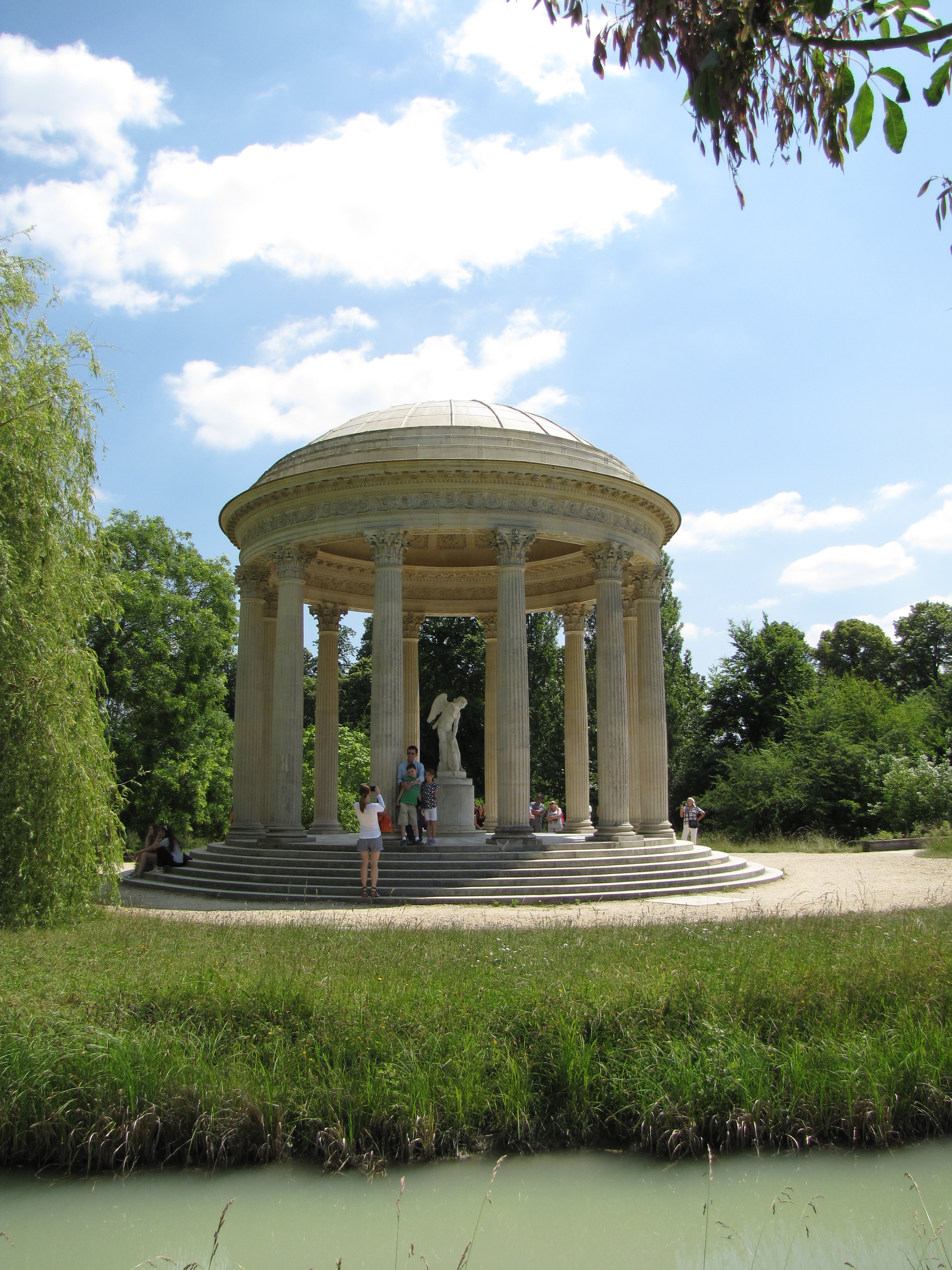 Trumbauer based his design on the Temple of Love at the Palace of Versailles created by Richard Mique specifically for Marie Antoinette. The domed memorial has a colonnade of Corinthian columns surrounding the statue of Cupid as its centerpiece.