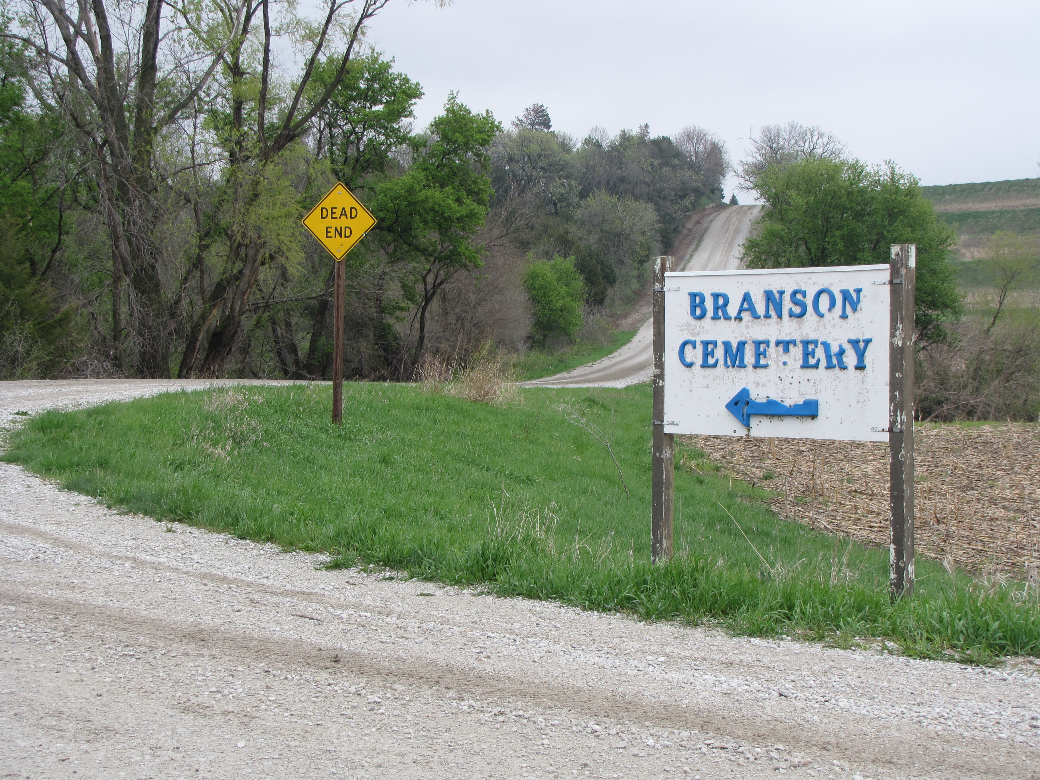 Not far from the Old Lincoln Highway (now marked County Road L20) going from Council Bluffs to Missouri Valley, just south of Loveland if you turn east on 170th and fish around on the gravel road until you get to the junction of Whitetail Lane, you run into the Branson Cemetery sign. Close to it is another sign, this one erected by the Pottawattamie County Road workers marking Whitetail Lane as a dead end. I wonder as they put the sign up if they saw the irony.