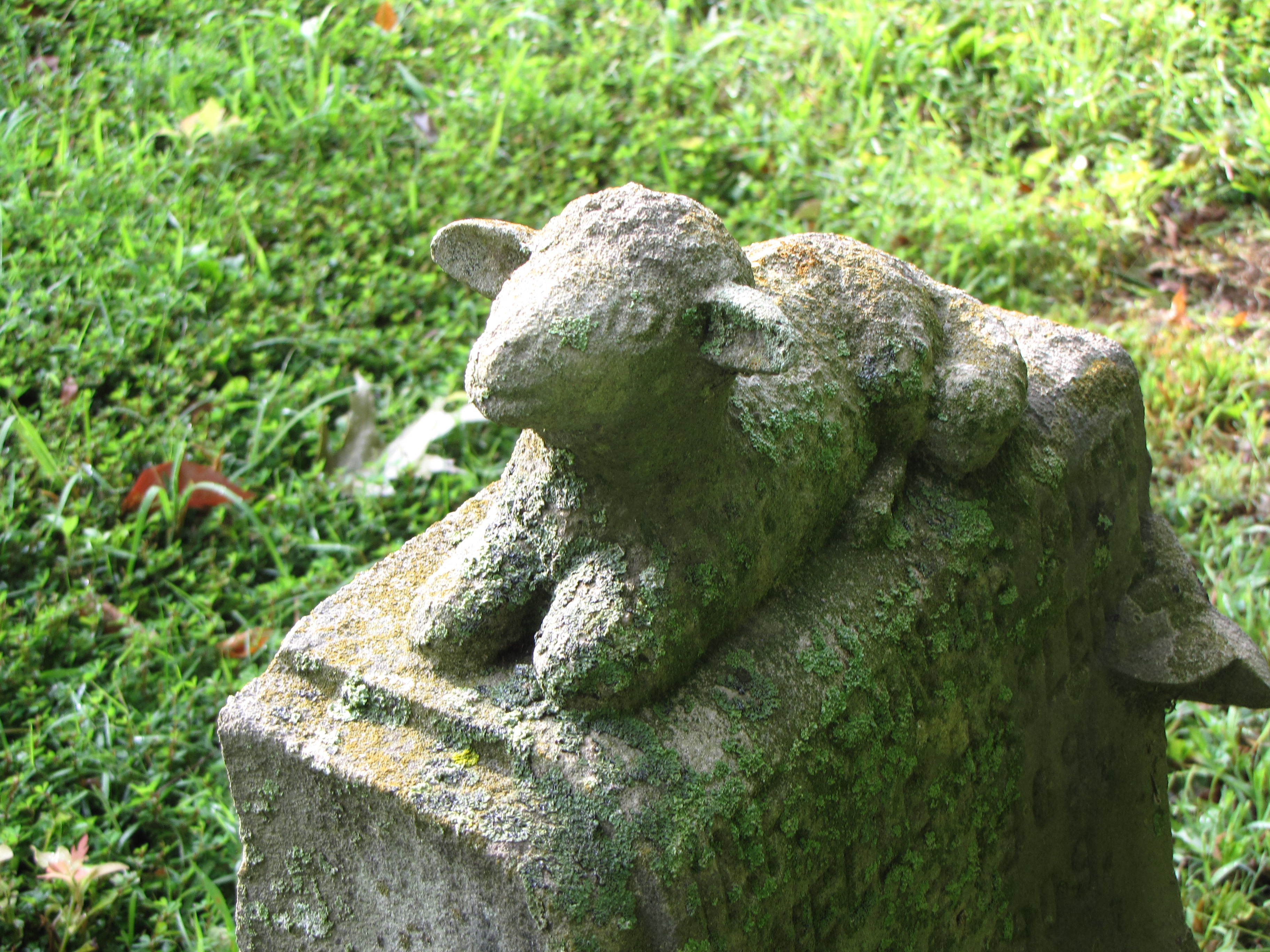 There are many gravestone symbols that seem to be ubiquitous—the lamb is one of them. Walk into nearly any American graveyard and you will find tiny little lambs marking the graves of mostly children. The lamb symbols come in many sizes and positions—often sleeping. But the lamb on the gravestone of an infant named Nellie in the Simpson’s Chapel Cemetery south of Bloomfield, Indiana, is raising its head up, eyes wide open, as if it is looking at the passersby. The lamb on Nellie’s gravestone, who died and was born in the same month in 1909, is aged and the light gray soft marble has eroded and gives the lamb the texture of a stuffed animal, soft and cuddly. The lamb, alert and bright eyed, looks like it could stand up at any moment and leap from the top of the stone.